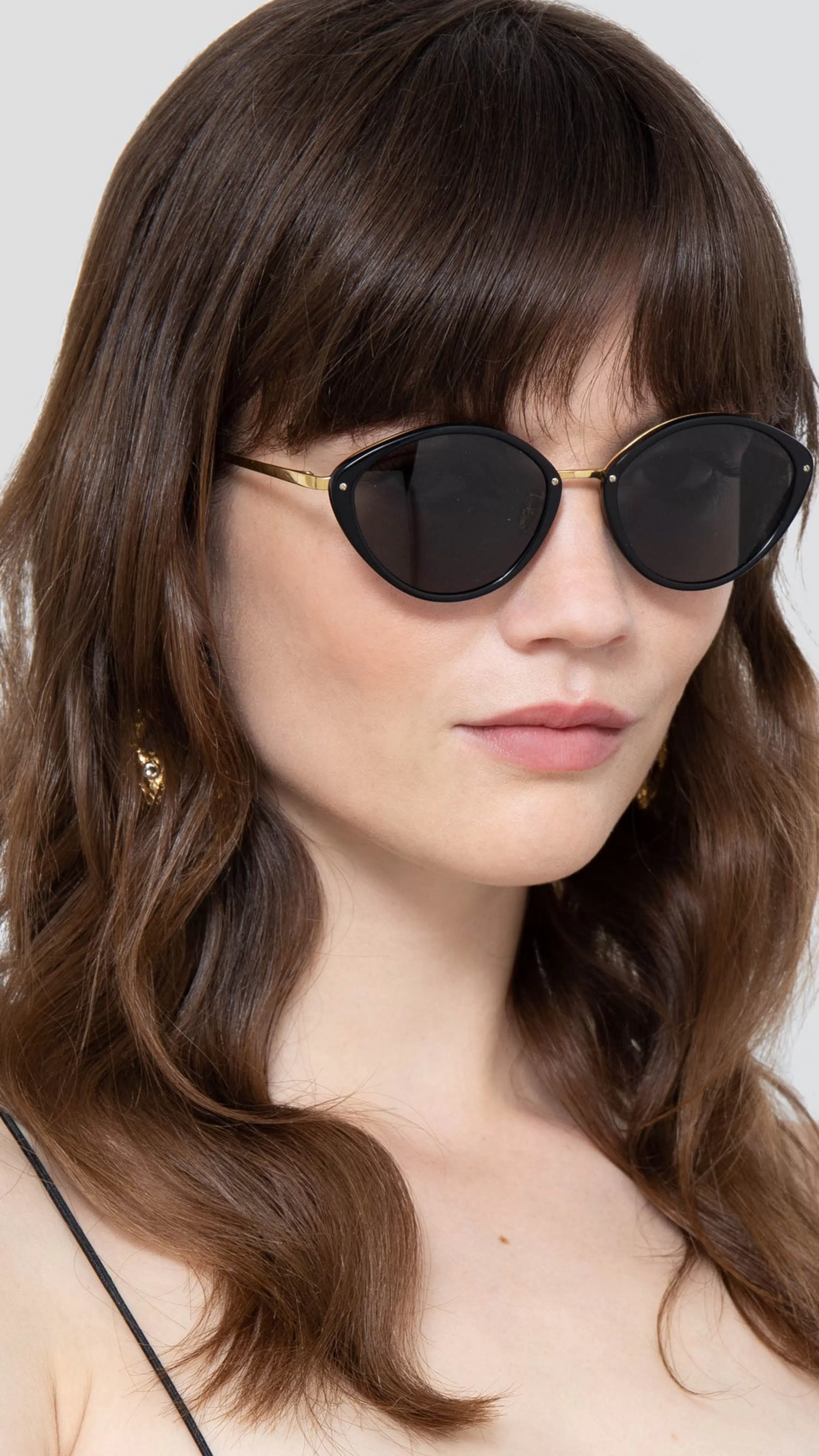 These delicate cat eye sunglasses from the LINDA FARROW collection employ a signature design language of the brand. Expertly polished optic white acetate rims are paired with a 22 carat light gold plated exposed titanium frame work running along the inner brow of the style.
