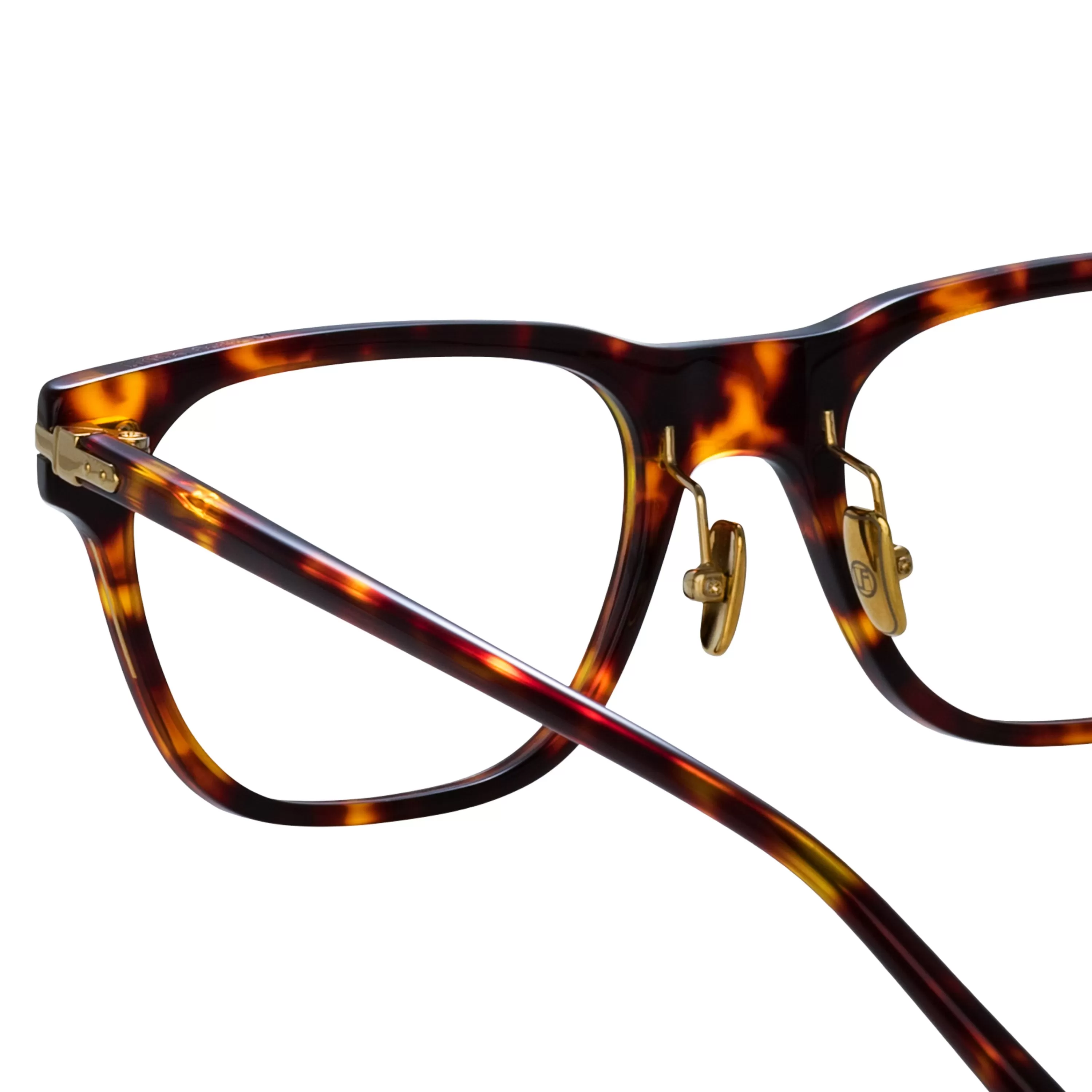 Inspired by strong architectural lines, these D-Frame optical glasses from the new Linda Farrow LINEAR collection are crafted from Tortoiseshell Italian hand polished acetate and ultra lightweight light gold-plated titanium.