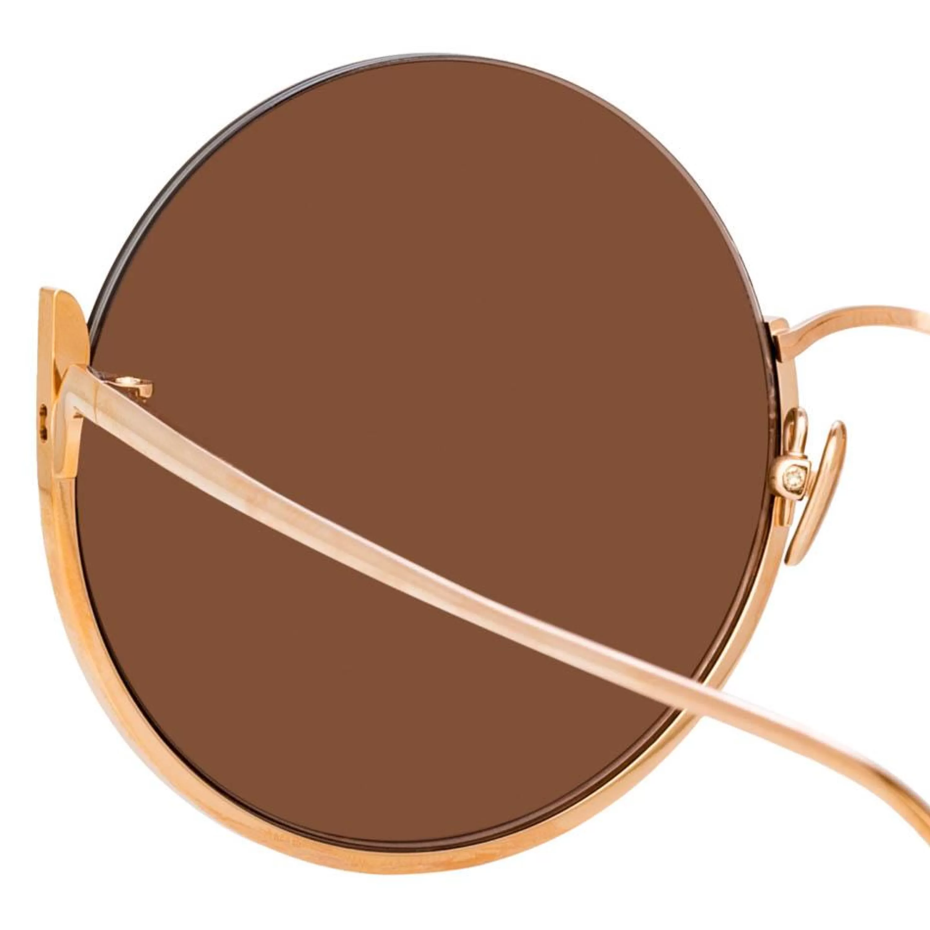 These oversized round lens sunglasses from the LINDA FARROW collection are delicately framed with 18 carat rose gold plated titanium. Sweeping below the lens the metal forms a half rim, exposing the upper edge of the blush pink lenses. Teamed with a sleek temple and adjustable nose pads for tailored fitting.