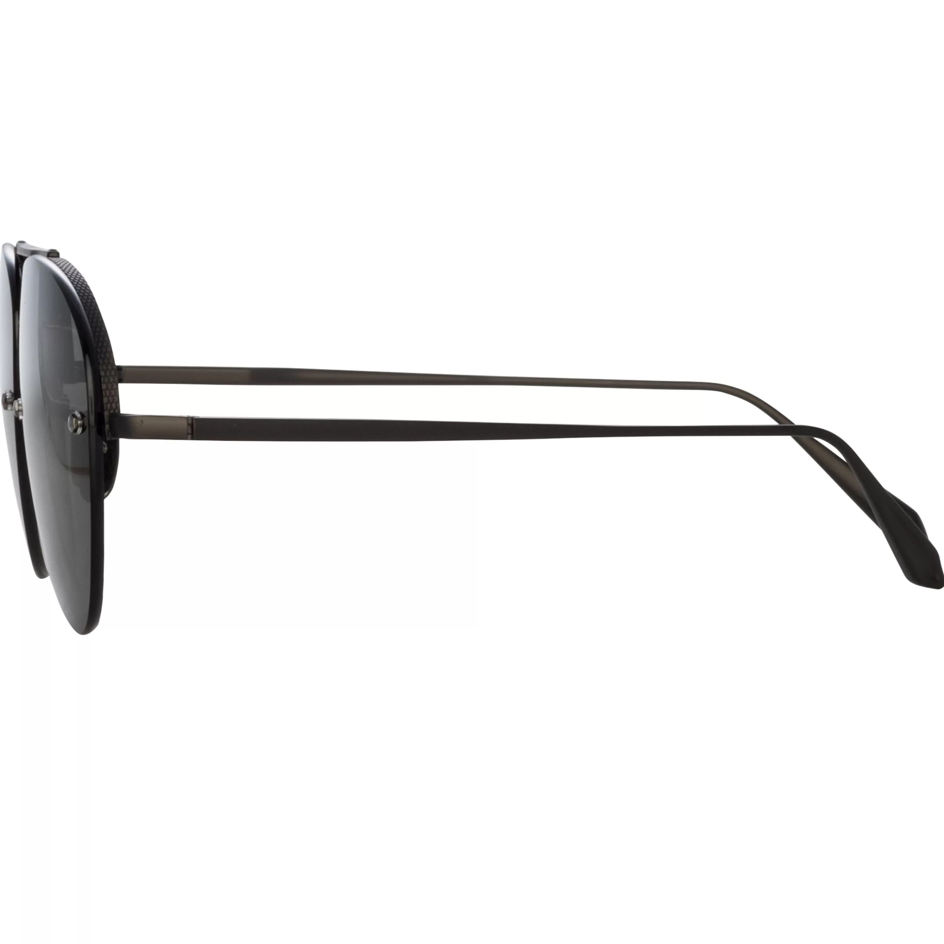 Introducing Edano. Luxurious aviator sunglasses from Linda Farrow featuring solid grey nylon lenses, contoured by a nickel Japanese titanium top bar with a matt nickel colour plating, inner rim and nose bridge.