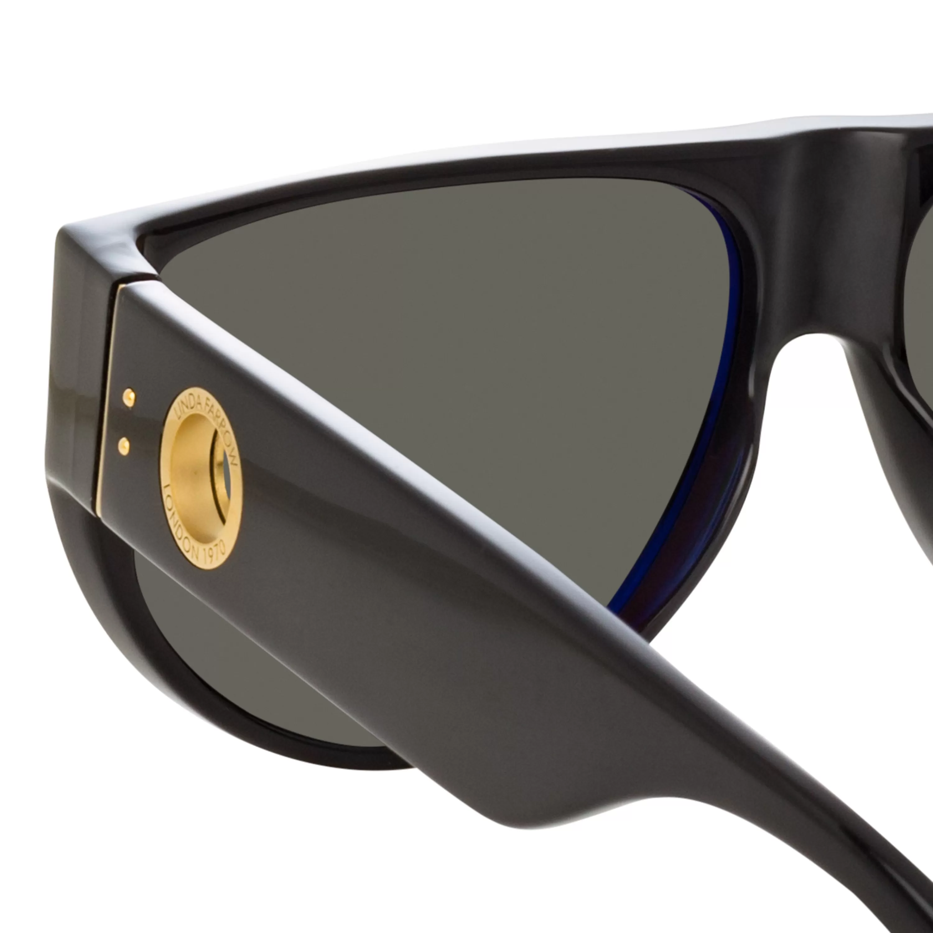 Formed from recycled black acetate these sculpted sunglasses from the LINDA FARROW collection are hand polished for a glossy finish. The flat top style features a gold plated titanium eyelet set into the temple monogrammed with ‘London 1970’ to mark the founding of the brand.