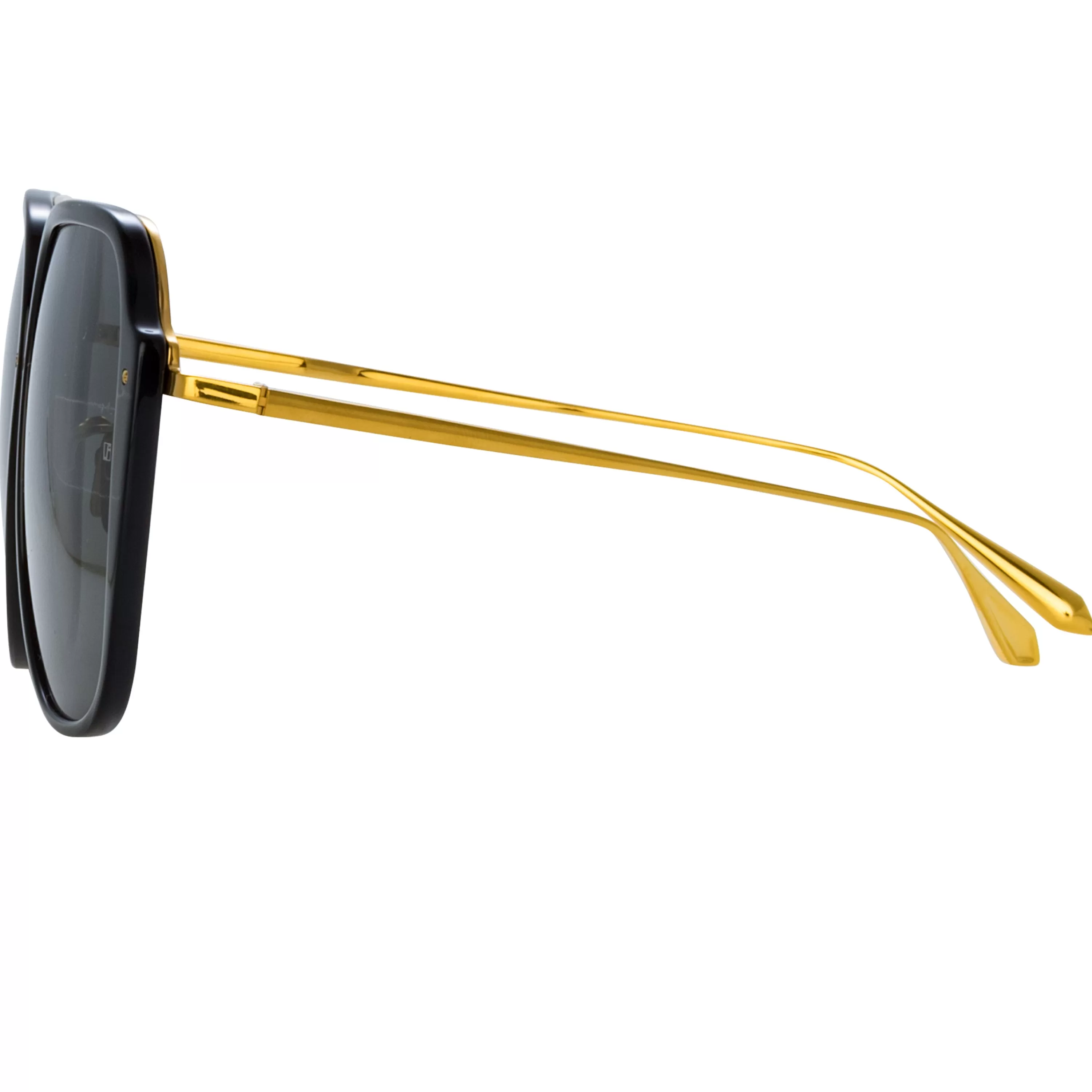 Experience luxury with the Sofia Oversize Sunglasses, expertly crafted from gold plated titanium and featuring grey solid lenses. These sunglasses are contoured with a chunky line of black acetate for a defined look, while the mid-frame titanium temples offer sleek and simple elegance.