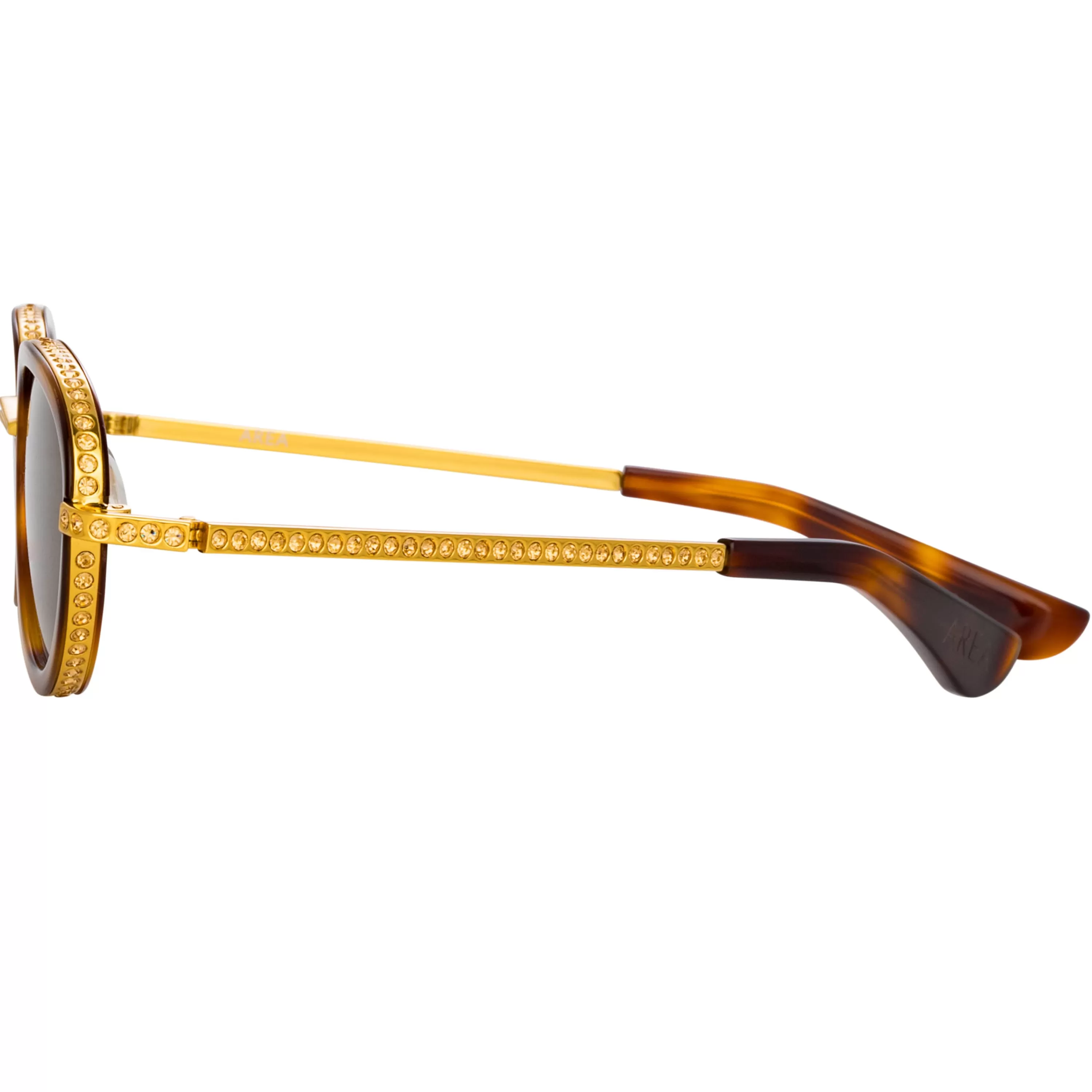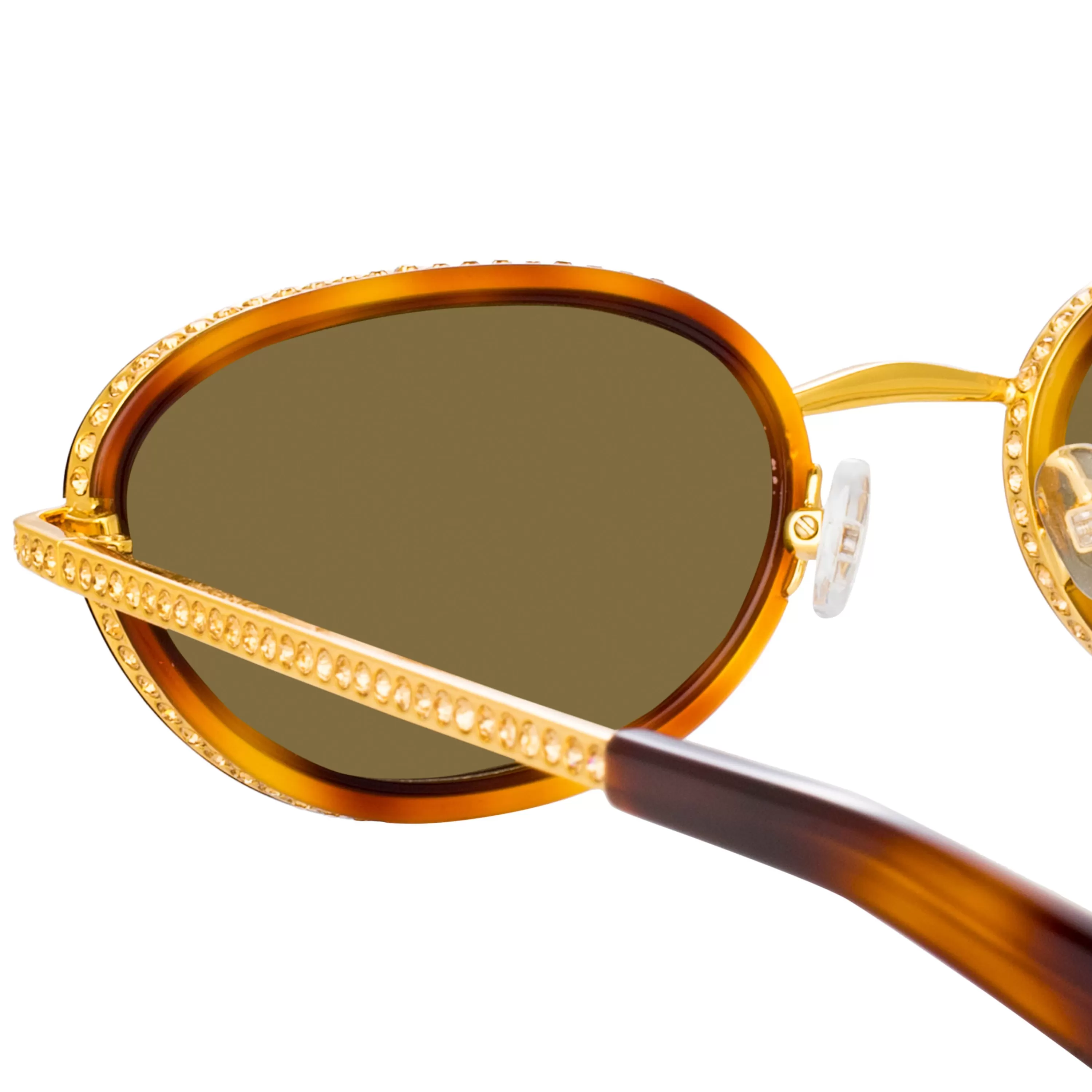 Introducing a new colour from our collaboration with AREA, these classic oval sunglasses in tortoise shell acetate are encircled with a crystallised stainless steel gold rim. The frame is fitted with solid brown sunglass lenses and completed with adjustable nose pads for a comfortable fit.