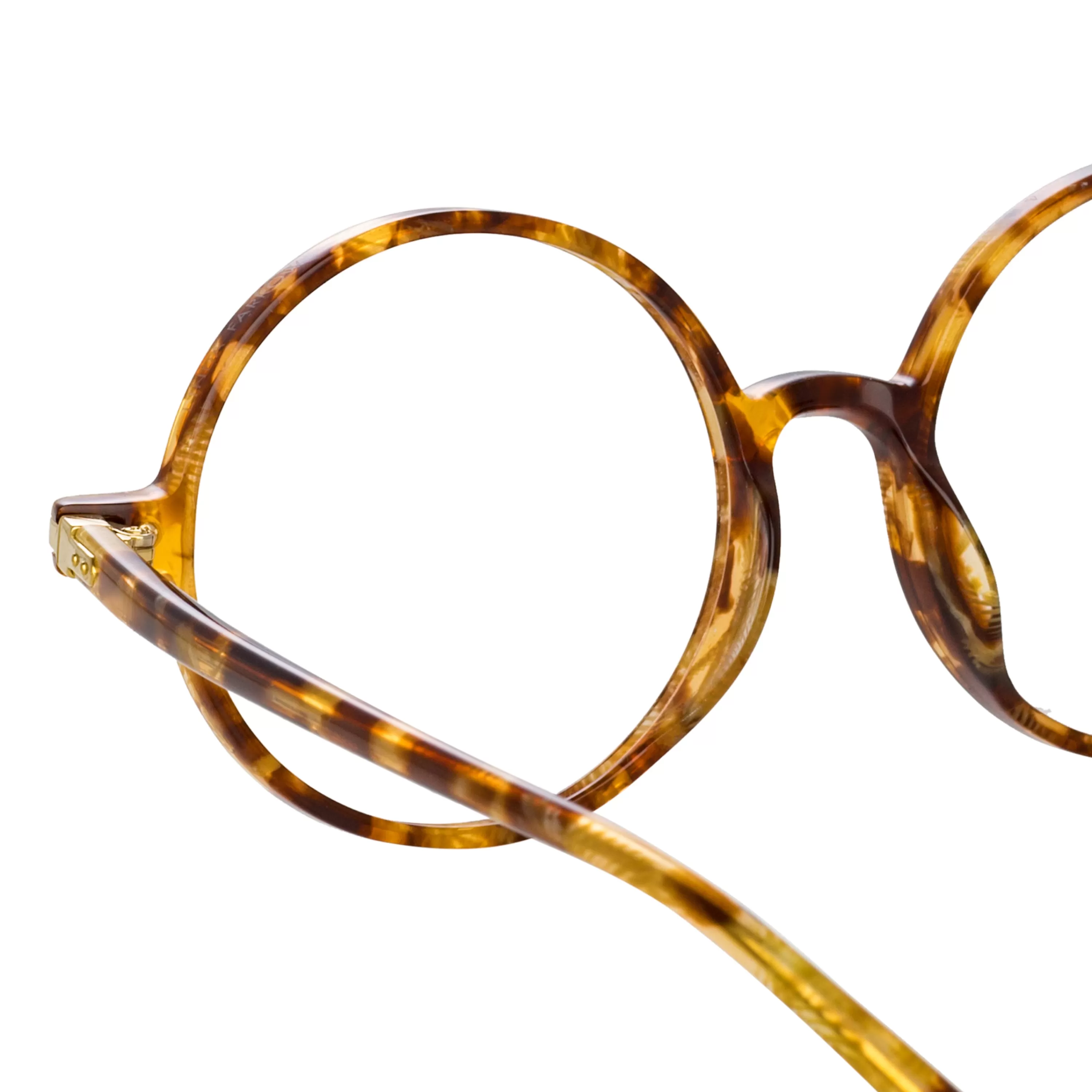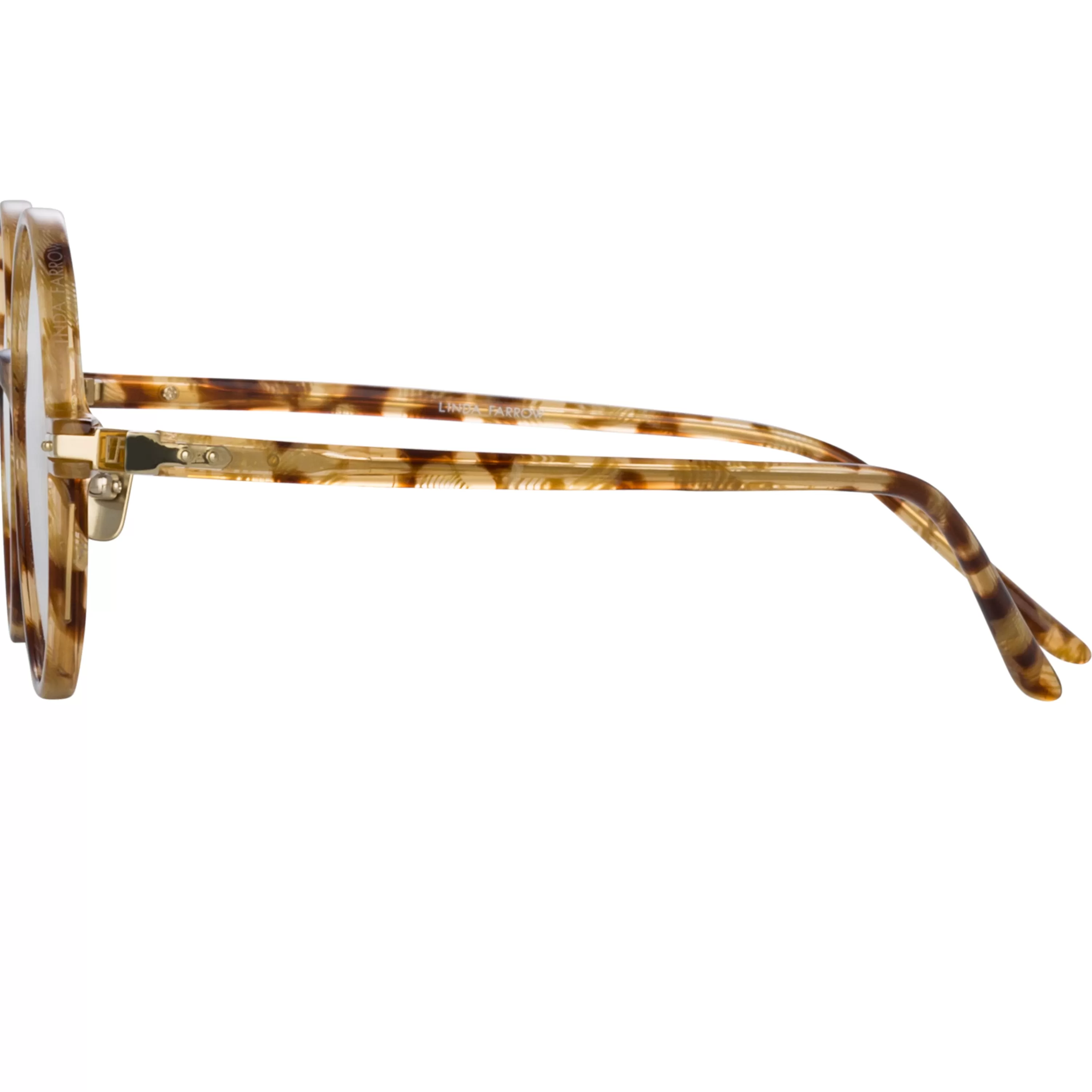 A modern classic these mid size round optical frames from the LINDA FARROW Linear collection are an everyday piece. Sculpted from tobacco tortoise shell acetate and teamed with laminated nose pads for a comfortable fit. Custom engineered 22 carat light gold plated hinges with a hidden ‘LF’ logo detail transition to sleek acetate temples. Subtle logo detailing at the brow, and a gold linear line running along the side of the rim complete the frame. Also available in Asian fitting.