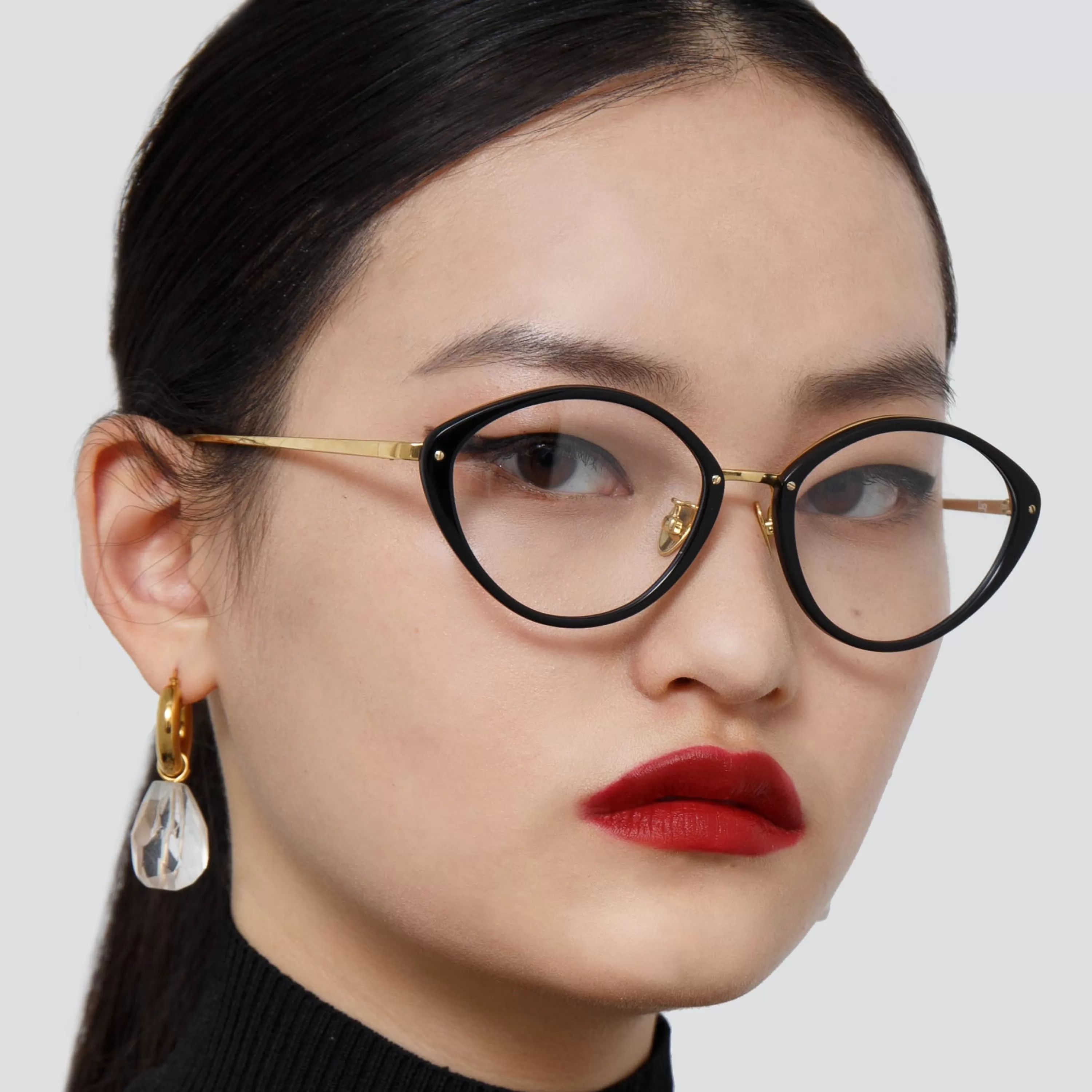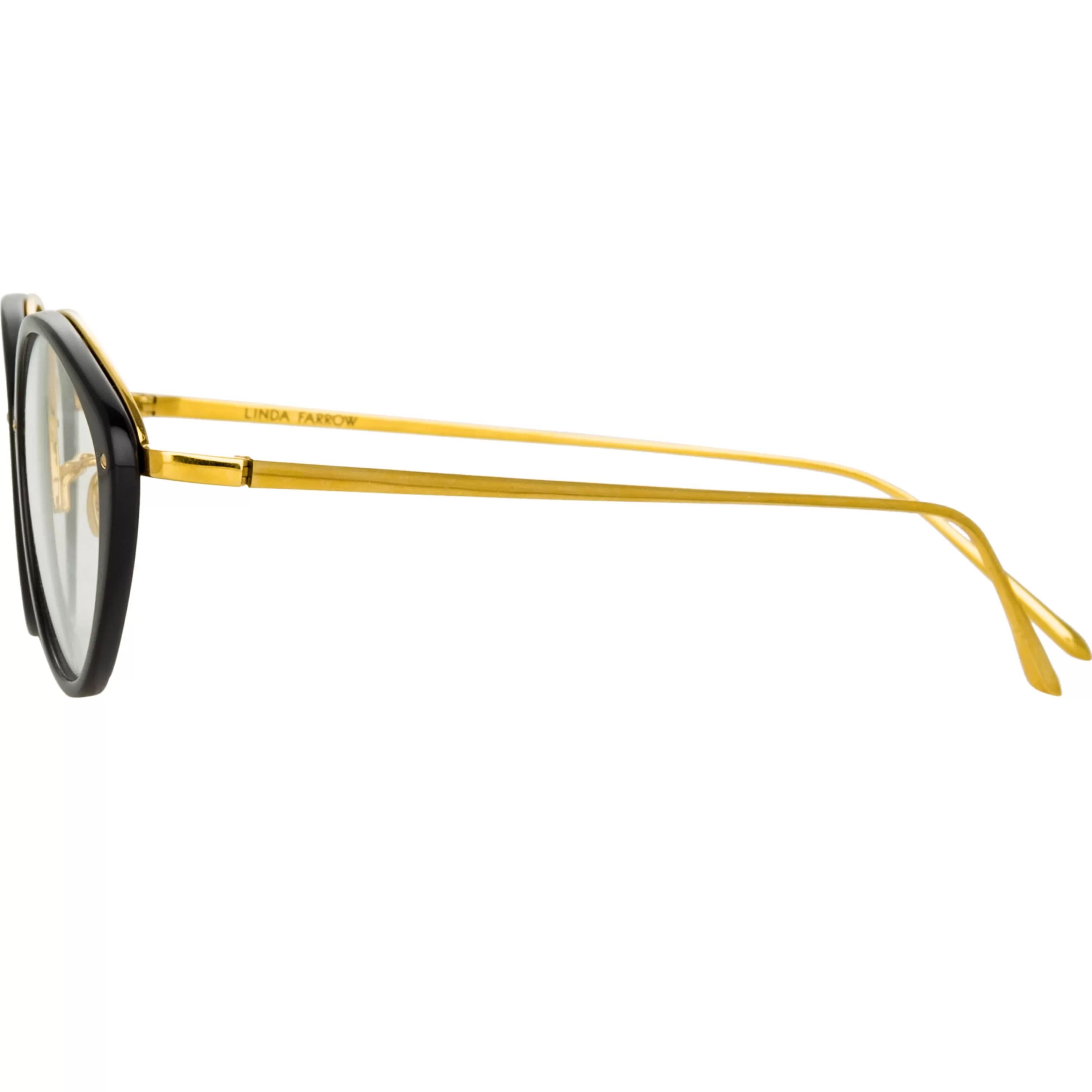 These delicate cat eye optical glasses from the LINDA FARROW collection employ a signature design language of the brand. Expertly polished recycled black acetate rims are paired with a 22 carat yellow gold plated exposed titanium frame work running along the inner brow of the style. The sleek tapered temples and adjustable nose pads ensure a comfortable fit.