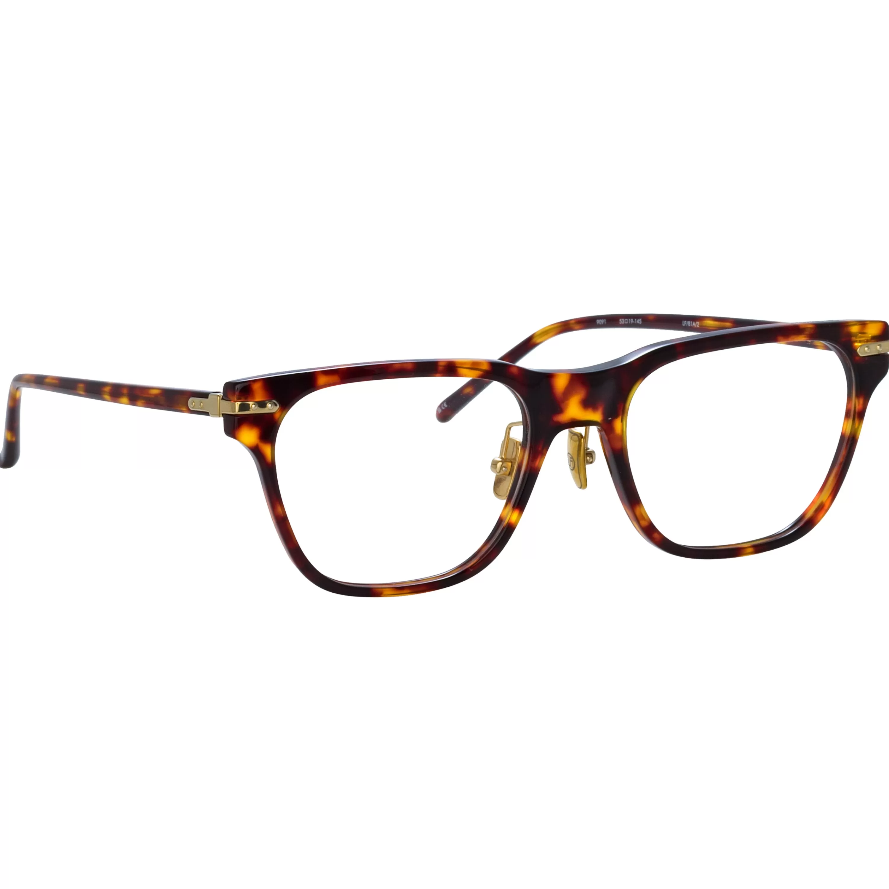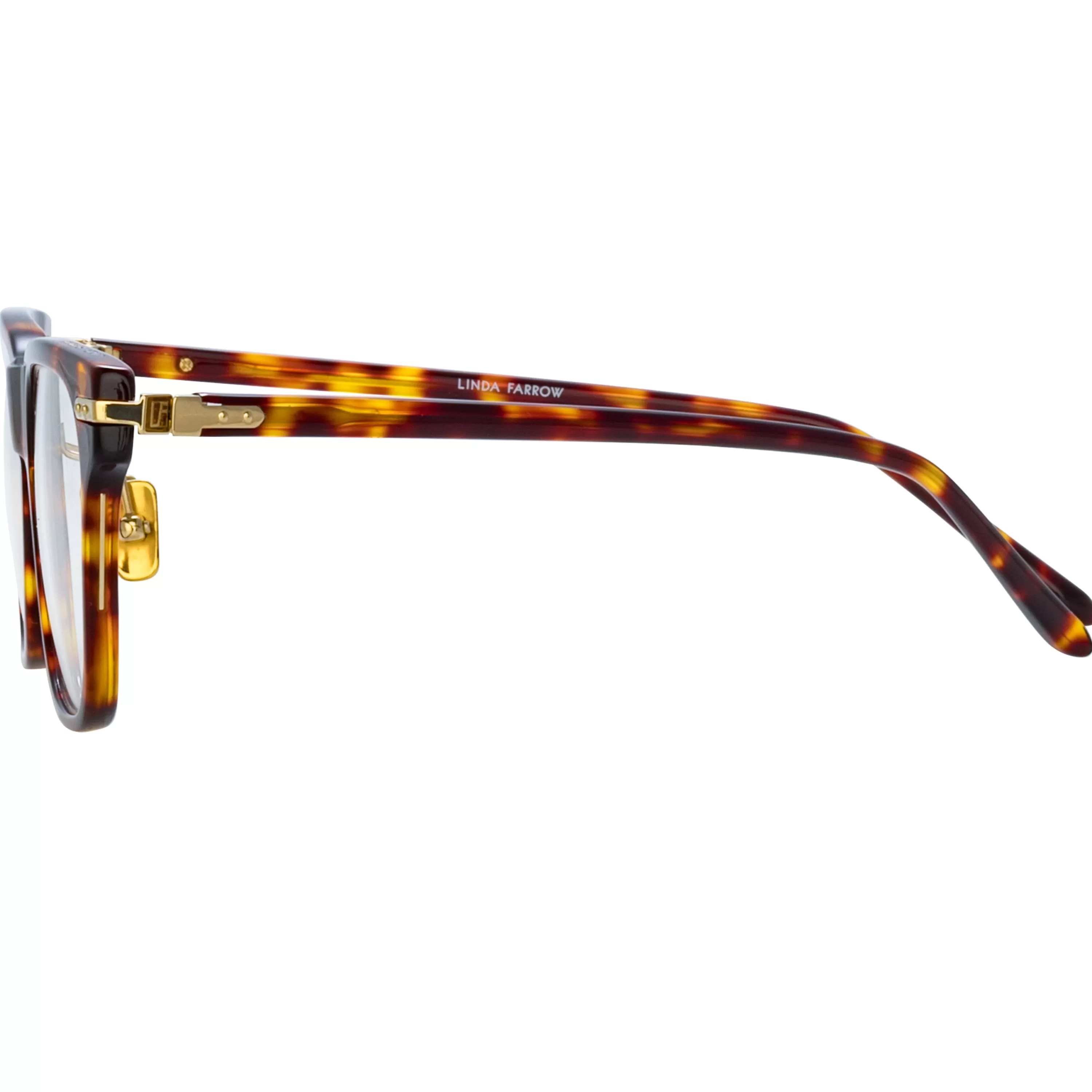 Inspired by strong architectural lines, these D-Frame optical glasses from the new Linda Farrow LINEAR collection are crafted from Tortoiseshell Italian hand polished acetate and ultra lightweight light gold-plated titanium.
