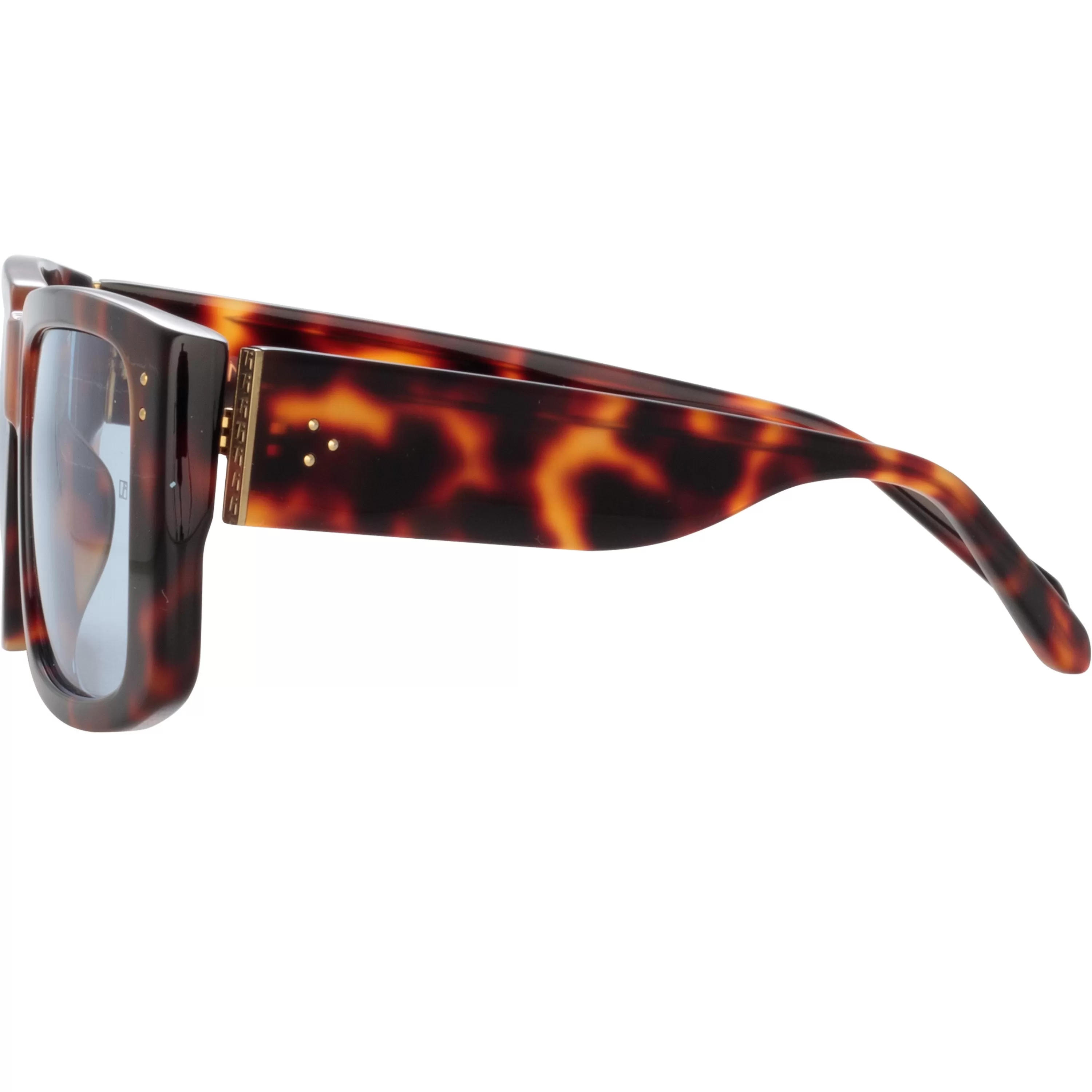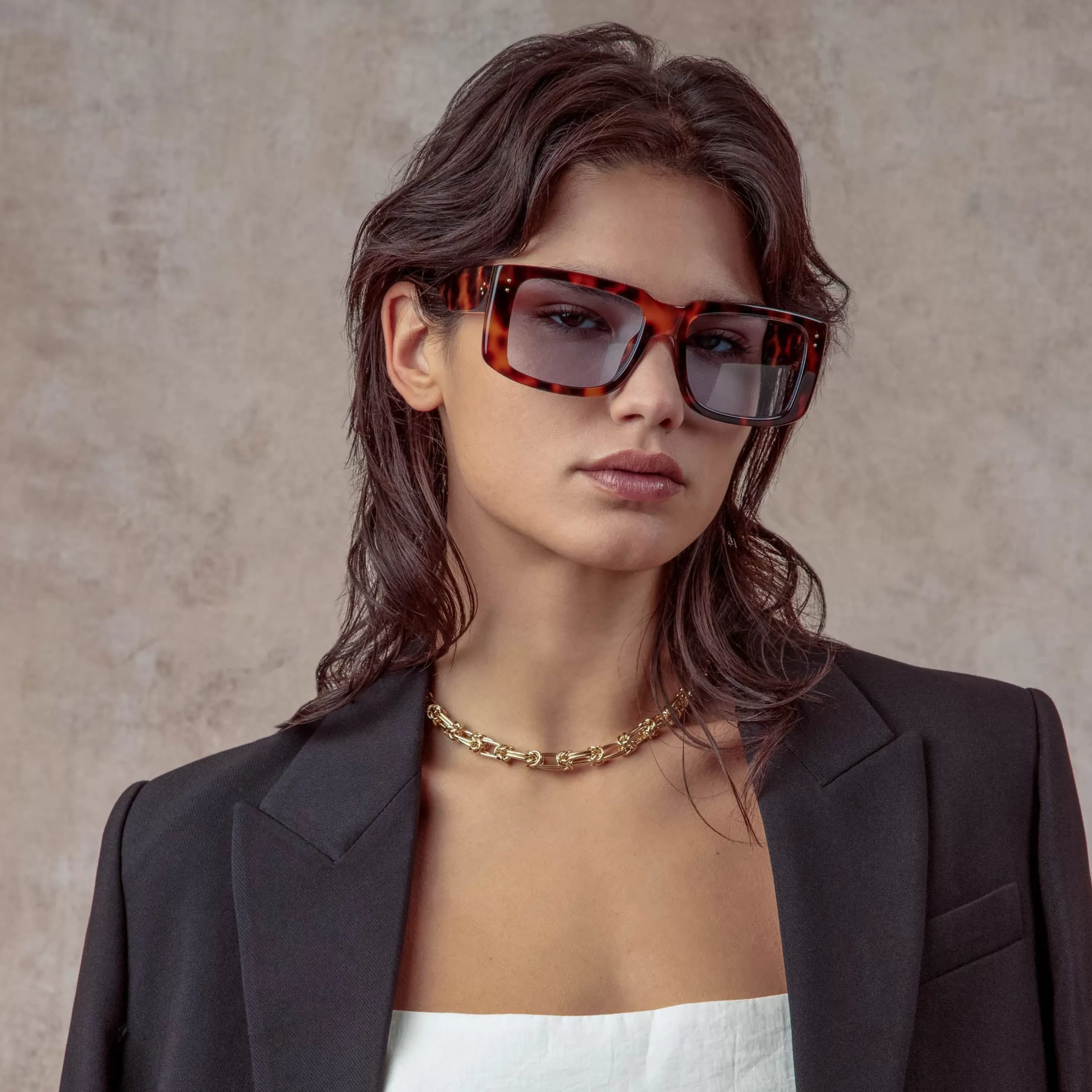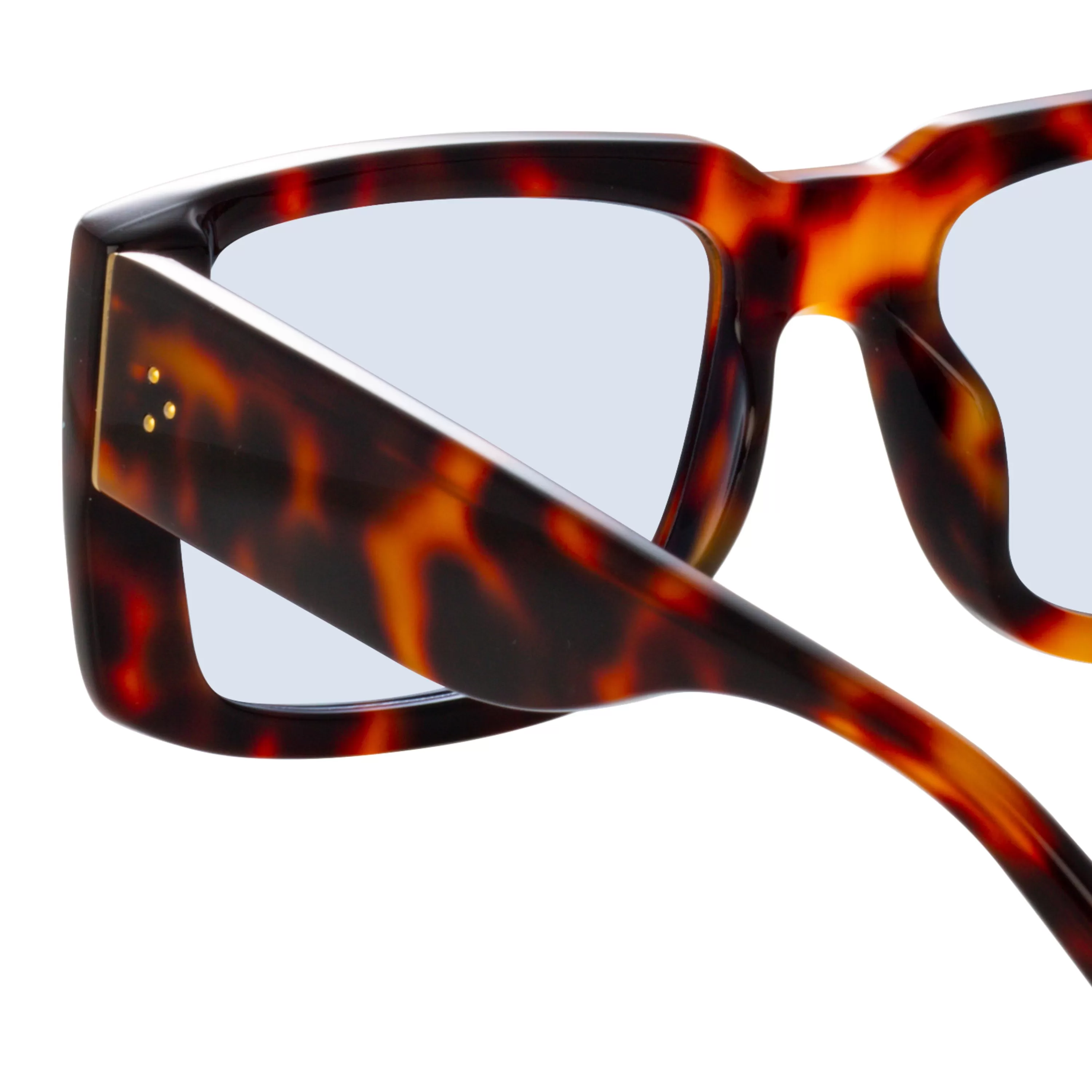Crafted from rich tortoiseshell acetate this bold frame is an experimentation of facets, these rectangular LINDA FARROW sunglasses juxtapose angular flat surface areas with soft sculpted corners. 22 carat yellow gold plated titanium hinges are paired with engineered screws to guarantee seamless movement.