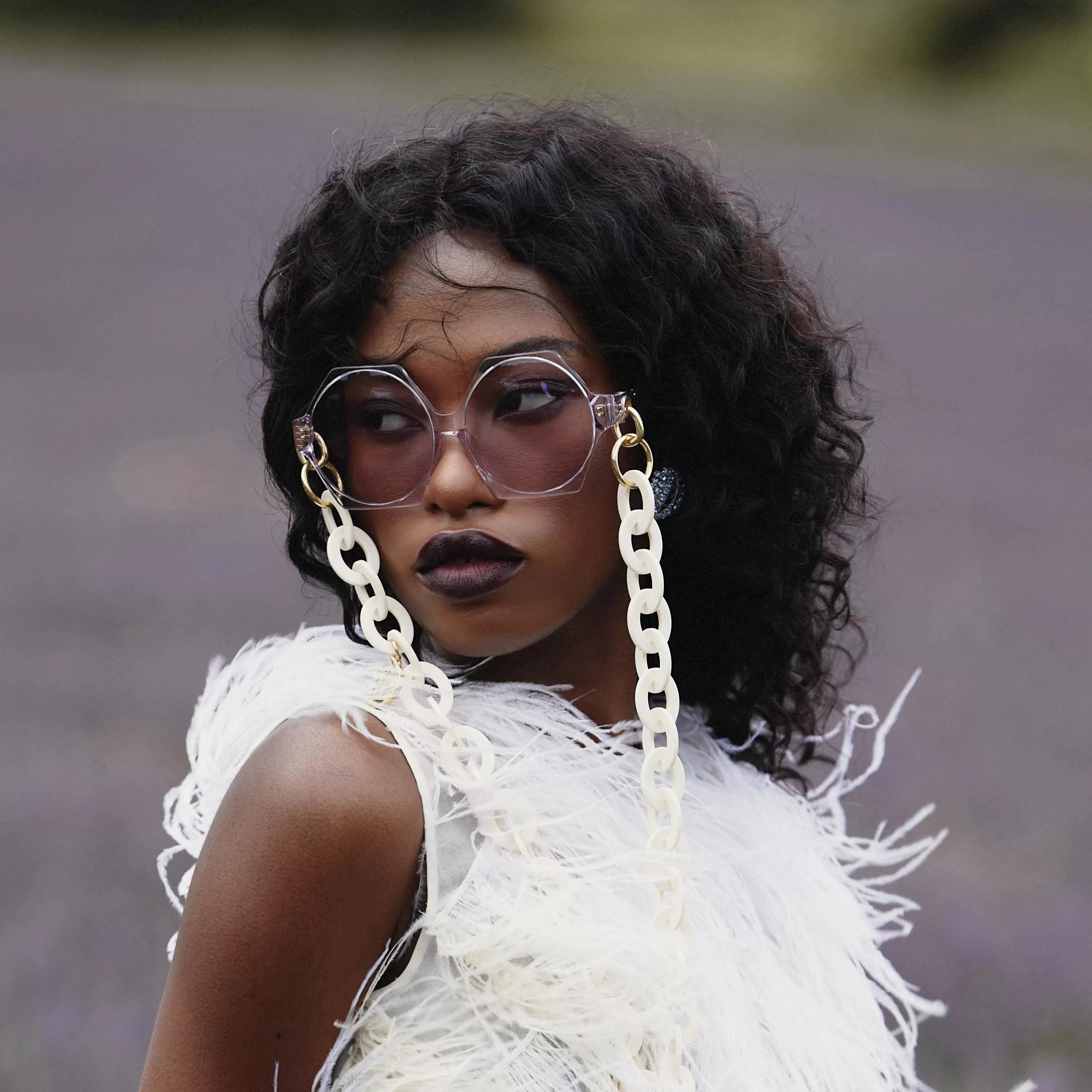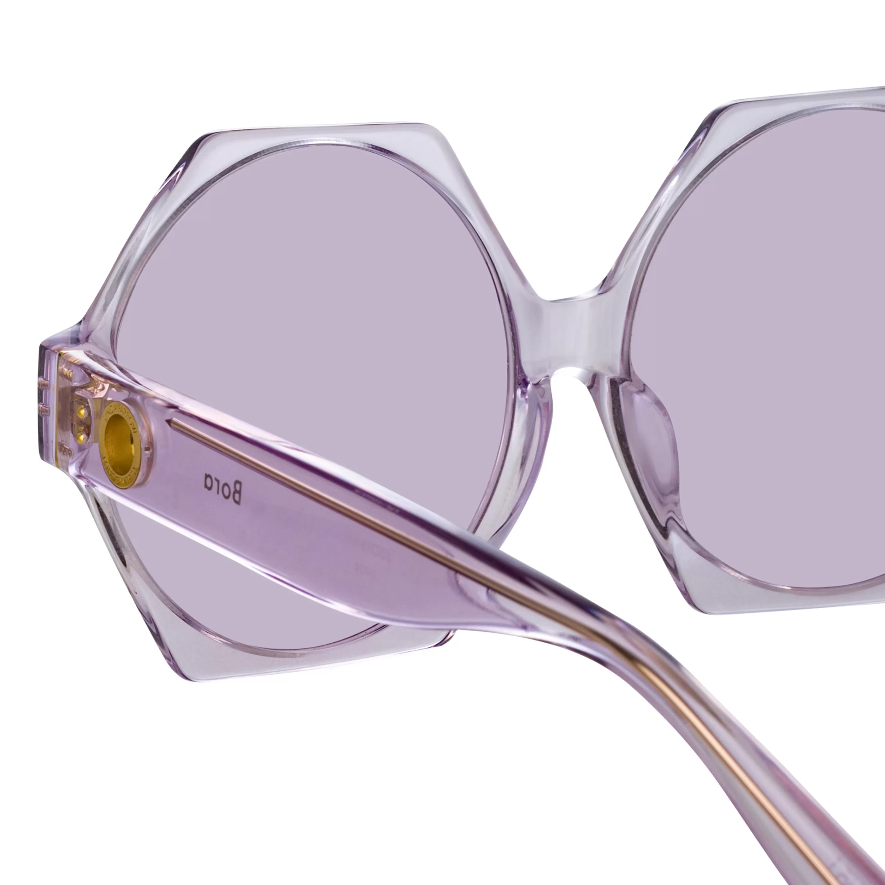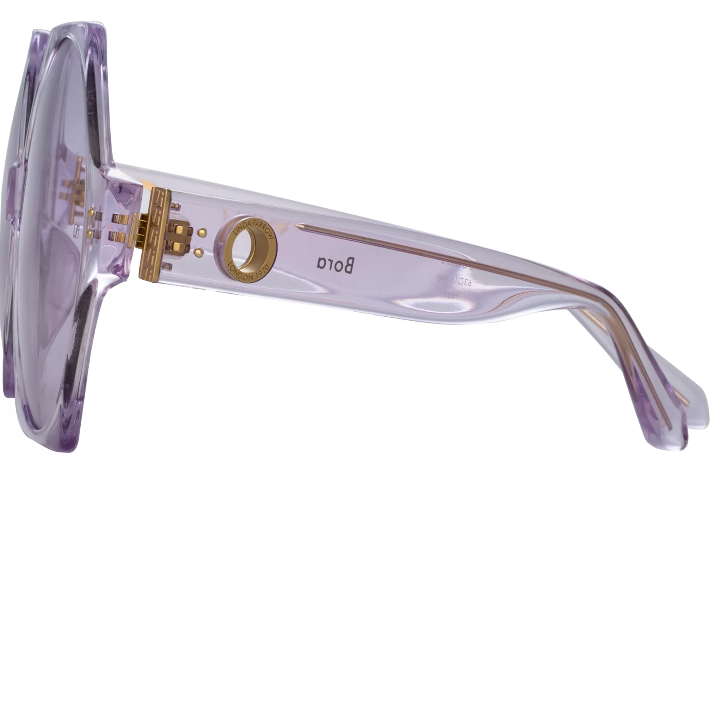 The Bora sunglasses from the LINDA FARROW collection are careful balance of size and weight. The round lenses allow the frame to be oversized without becoming heavy and are juxtaposed with a fine angular acetate frame. Hewn from translucent lavender acetate the style carries sculpted nose pads and temple tips for comfort.