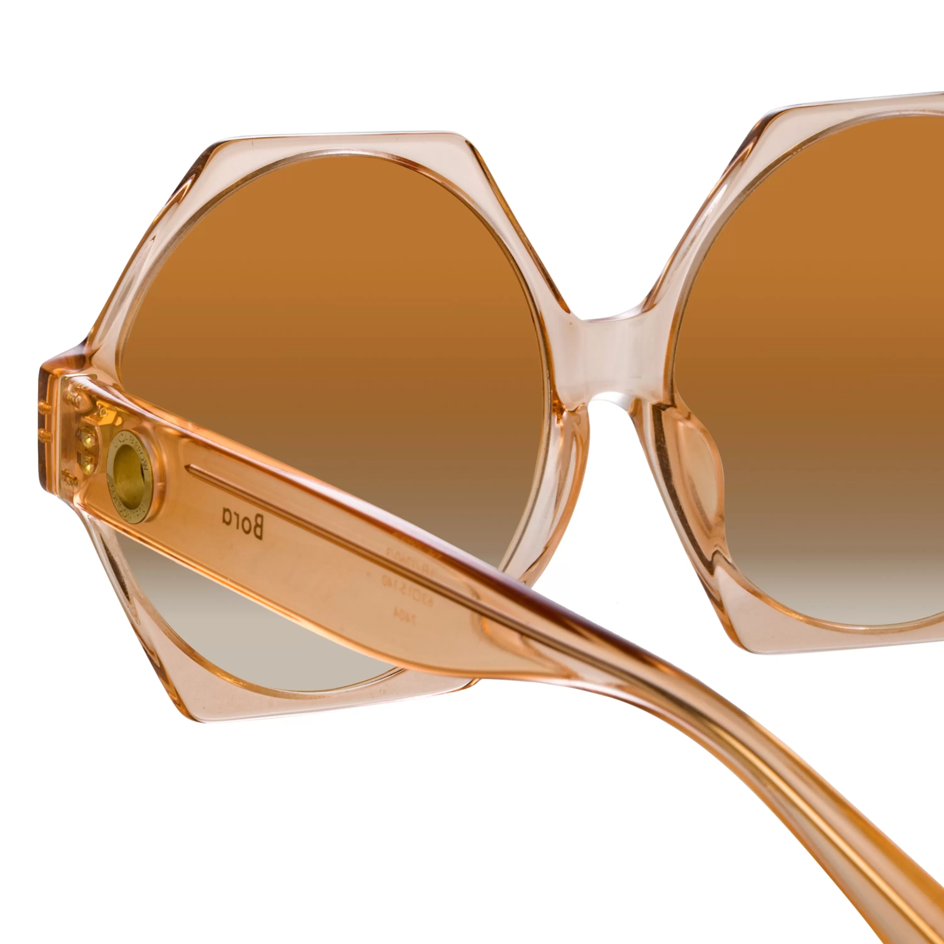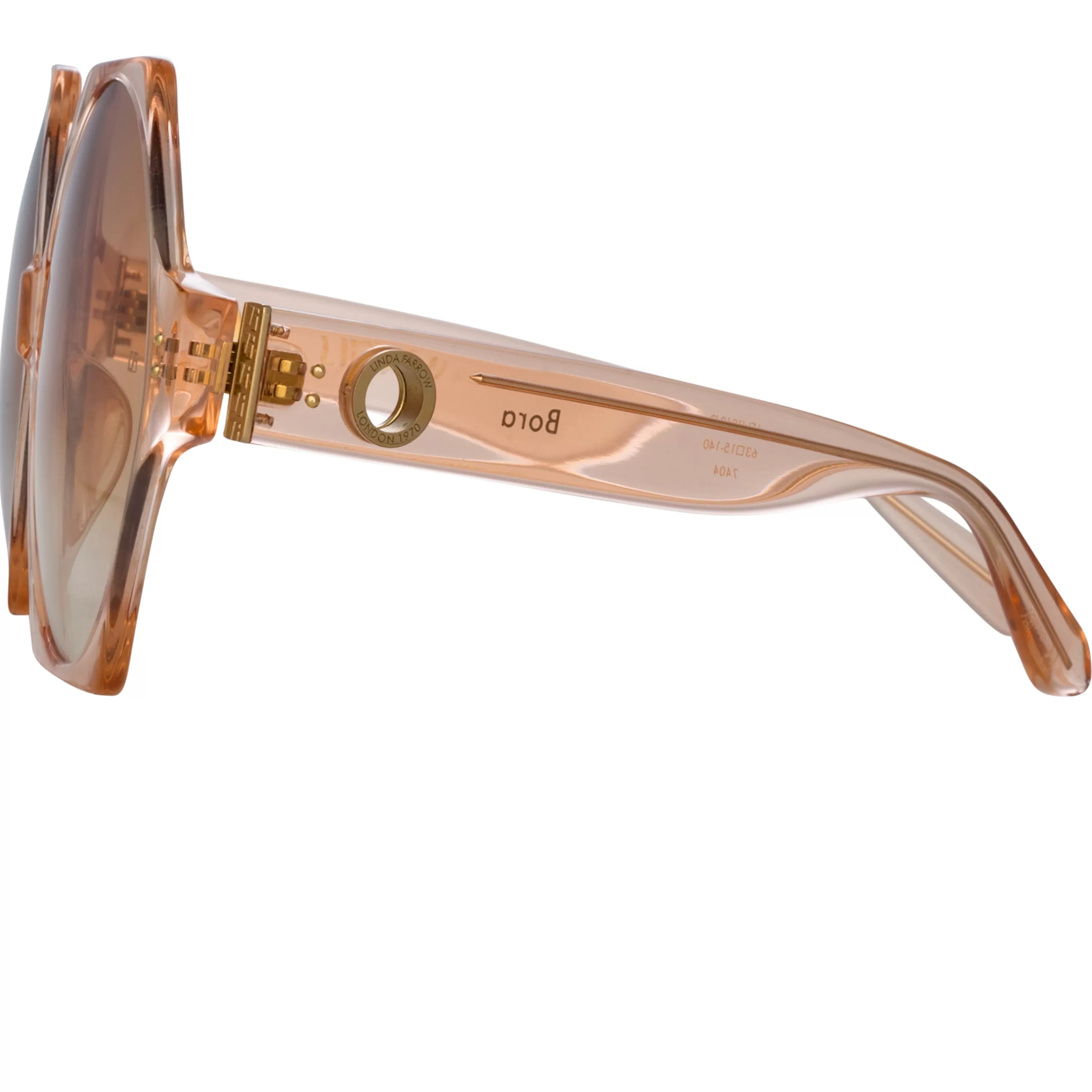 The Bora sunglasses from the LINDA FARROW collection are careful balance of size and weight. The round lenses allow the frame to be oversized without becoming heavy and are juxtaposed with a fine angular acetate frame. Hewn from translucent peach acetate the style carries sculpted nose pads and temple tips for comfort.