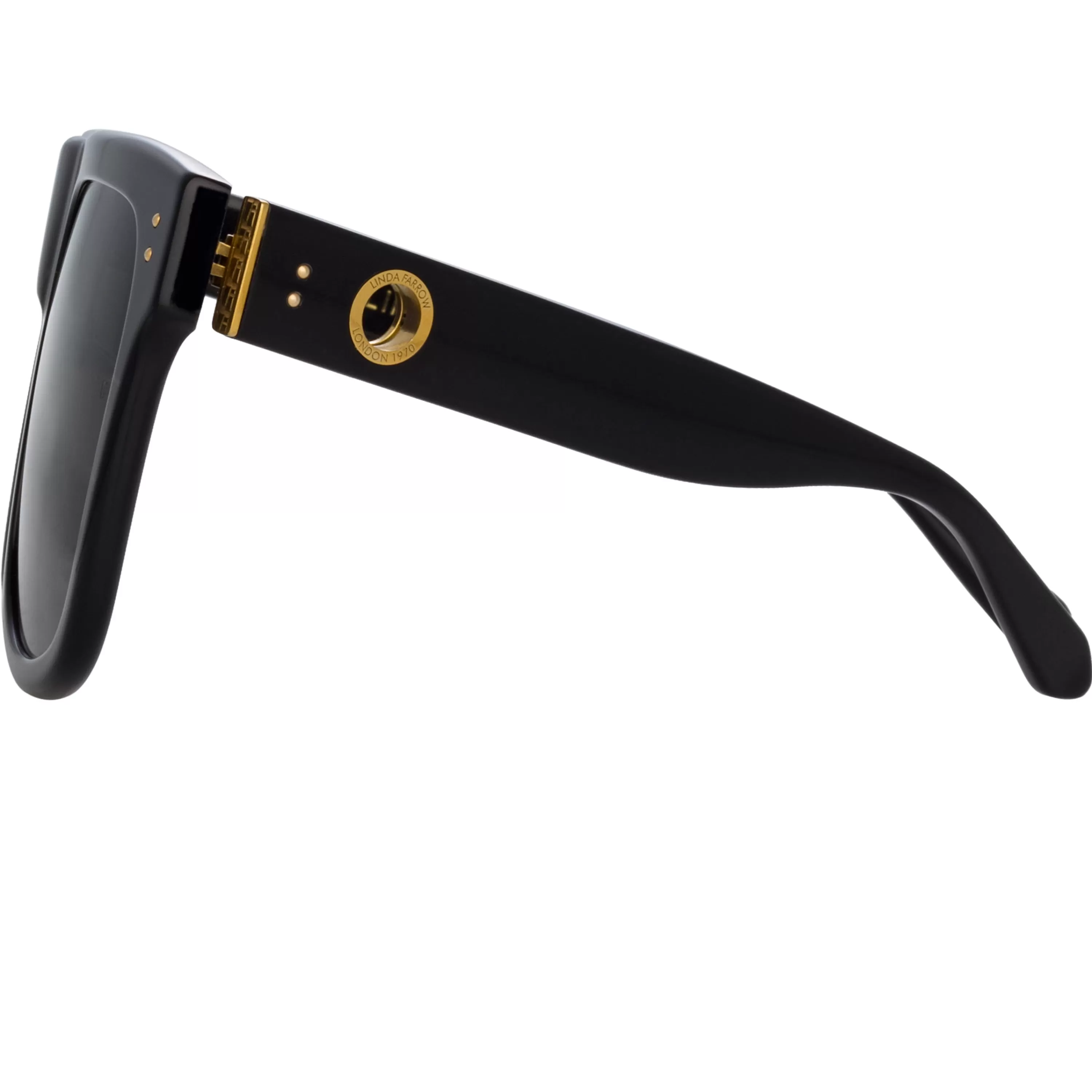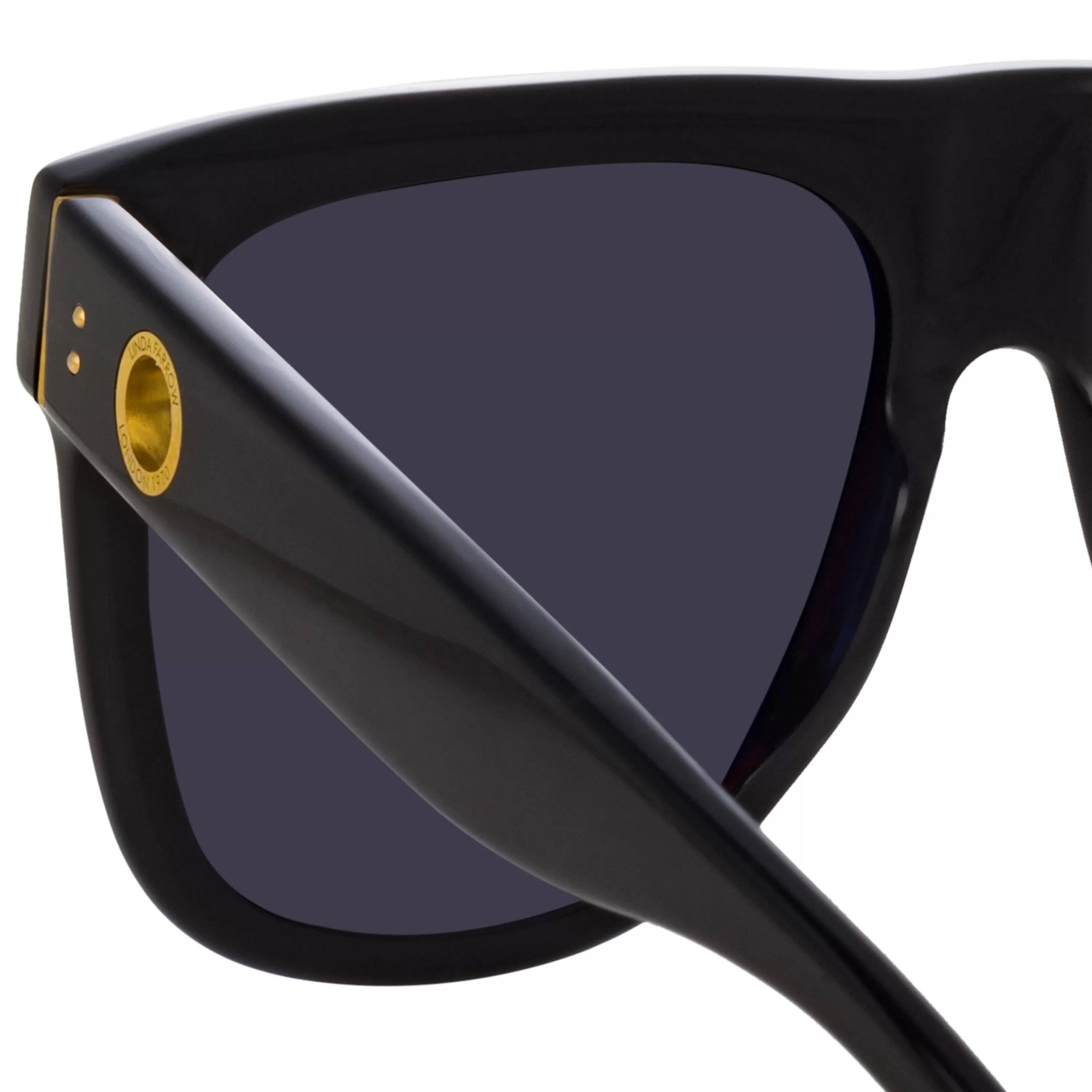 Emanating cool, these glossy acetate flat-top sunglasses from the LINDA FARROW collection are crafted from recycled black acetate. Sculpted nose pads and temple tips provide comfort to the wearer. Our signature gold plated eyelet, compatible with our accessories, is set into the temple and celebrates the founding of the brand in ‘London 1970’. The style is fitted with solid grey ZEISS technology lenses which offer anti-glare and complete UV protection.