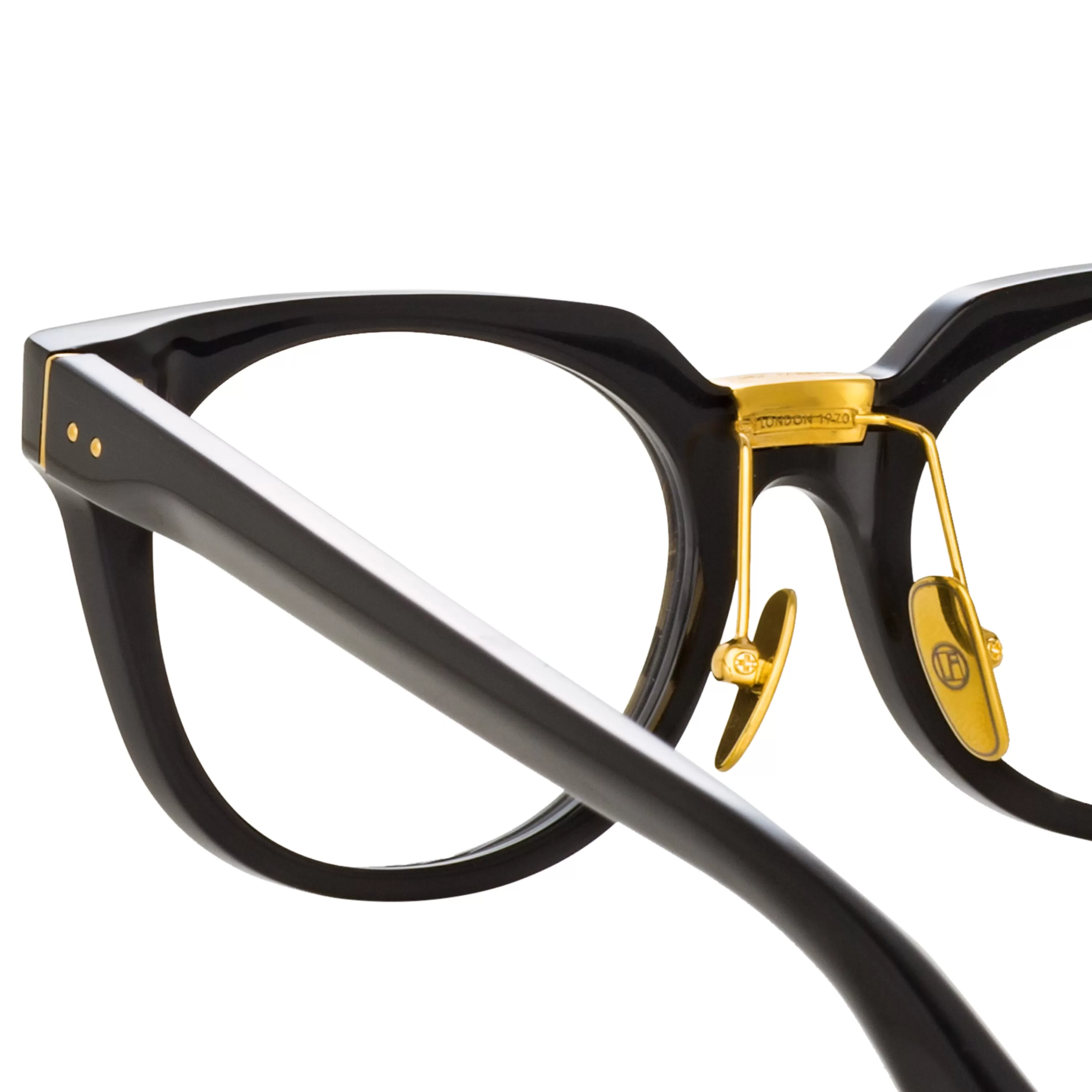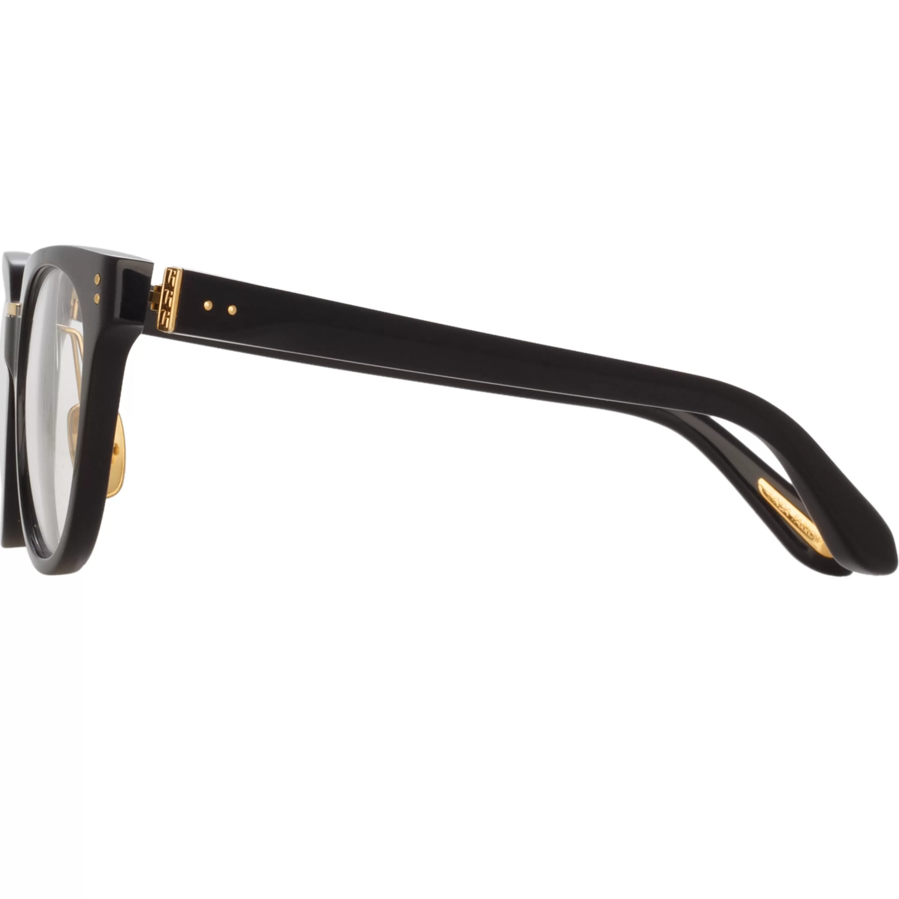 The Delphine employs signature detailing to elevate and add contrast. The subtle cat eye optical glasses are sculpted from recycled black acetate, the brow leading to a squared titanium bridge detail.