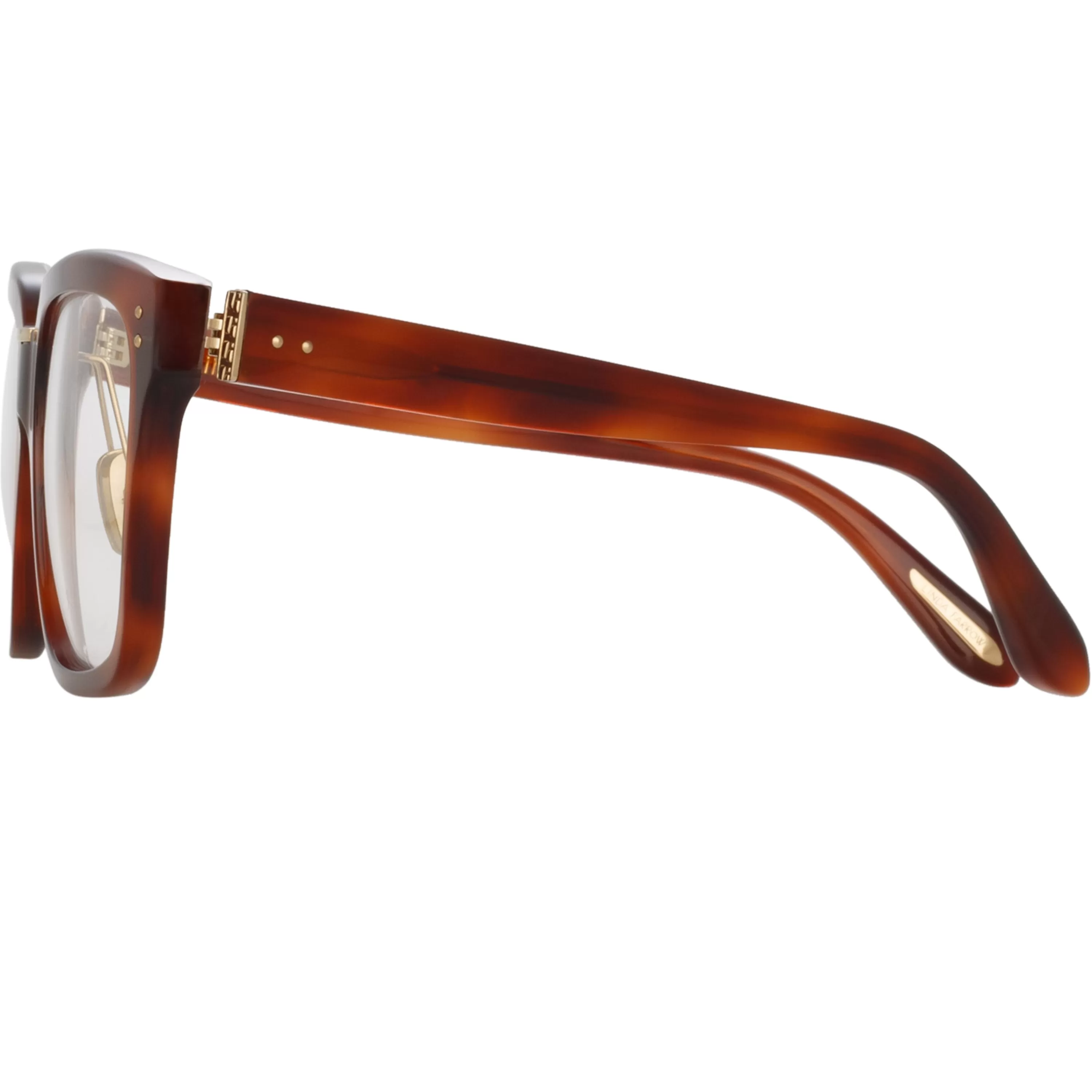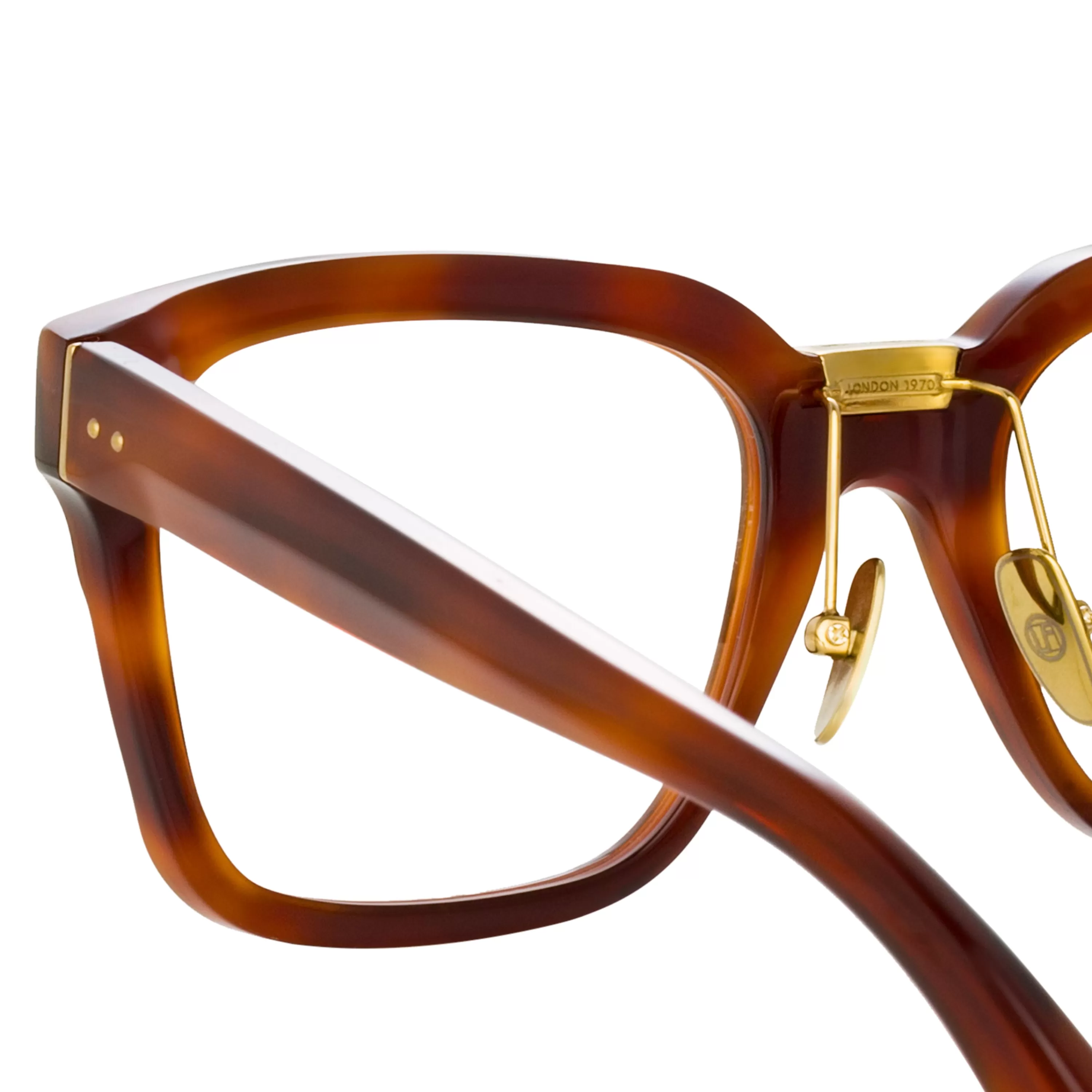 Subtle highlights elevate these chunky D-frame optical glasses from the LINDA FARROW collection. Crafted from amber horn acetate the highly polished frame is capped at the bridge with a 22 carat light gold plated titanium detail carrying the LINDA FARROW logo which transitions to adjustable nose pads.