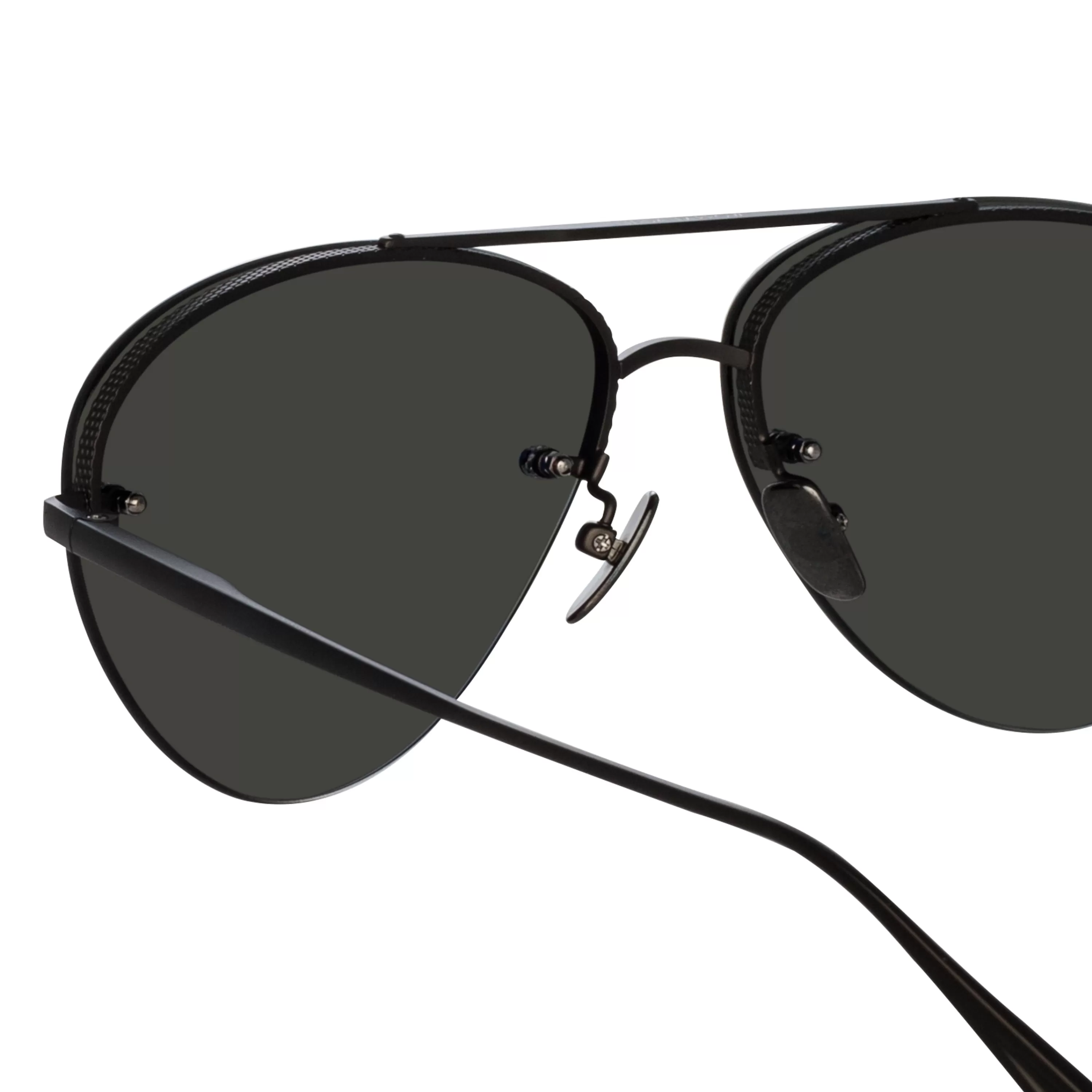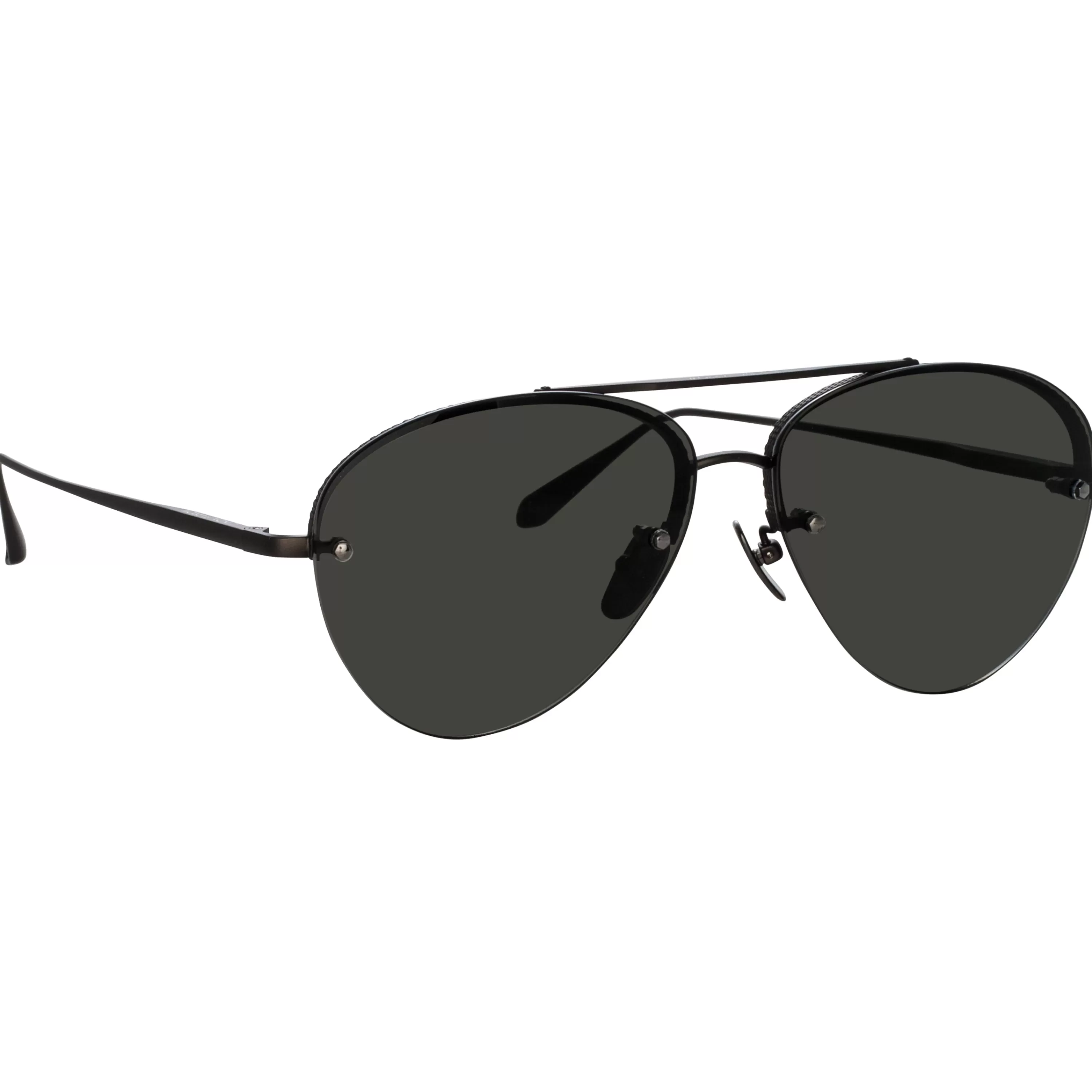 Introducing Edano. Luxurious aviator sunglasses from Linda Farrow featuring solid grey nylon lenses, contoured by a nickel Japanese titanium top bar with a matt nickel colour plating, inner rim and nose bridge.