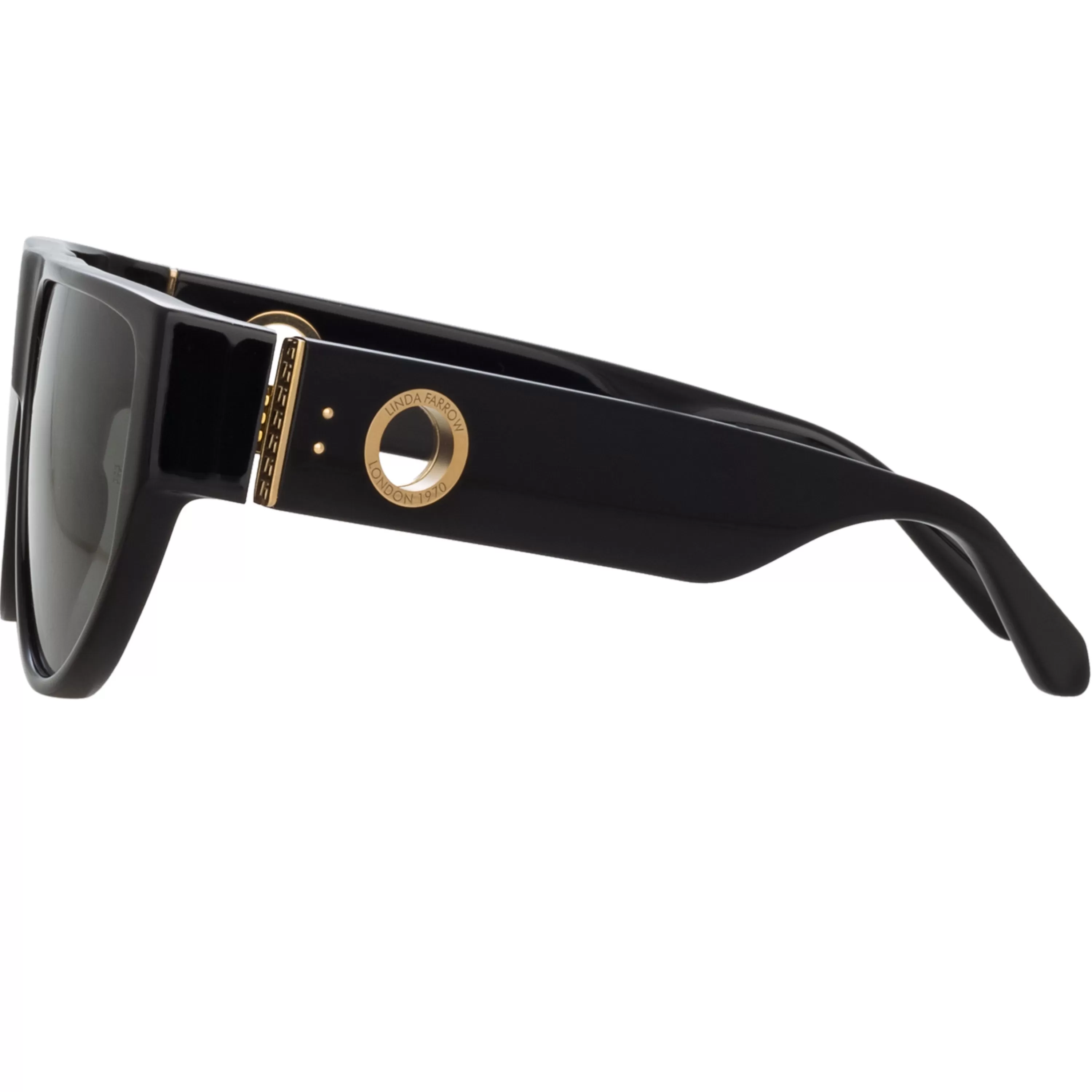 Formed from recycled black acetate these sculpted sunglasses from the LINDA FARROW collection are hand polished for a glossy finish. The flat top style features a gold plated titanium eyelet set into the temple monogrammed with ‘London 1970’ to mark the founding of the brand.