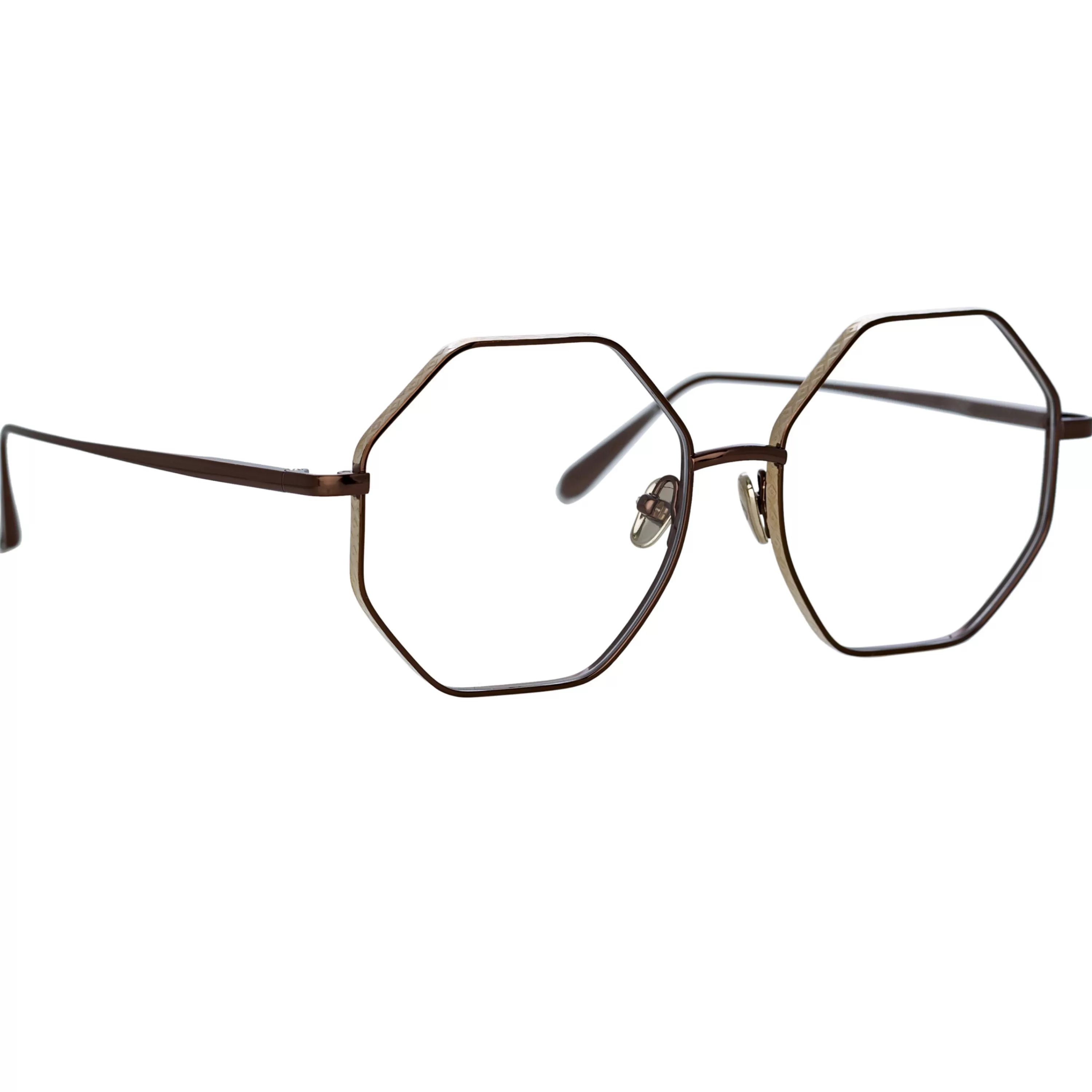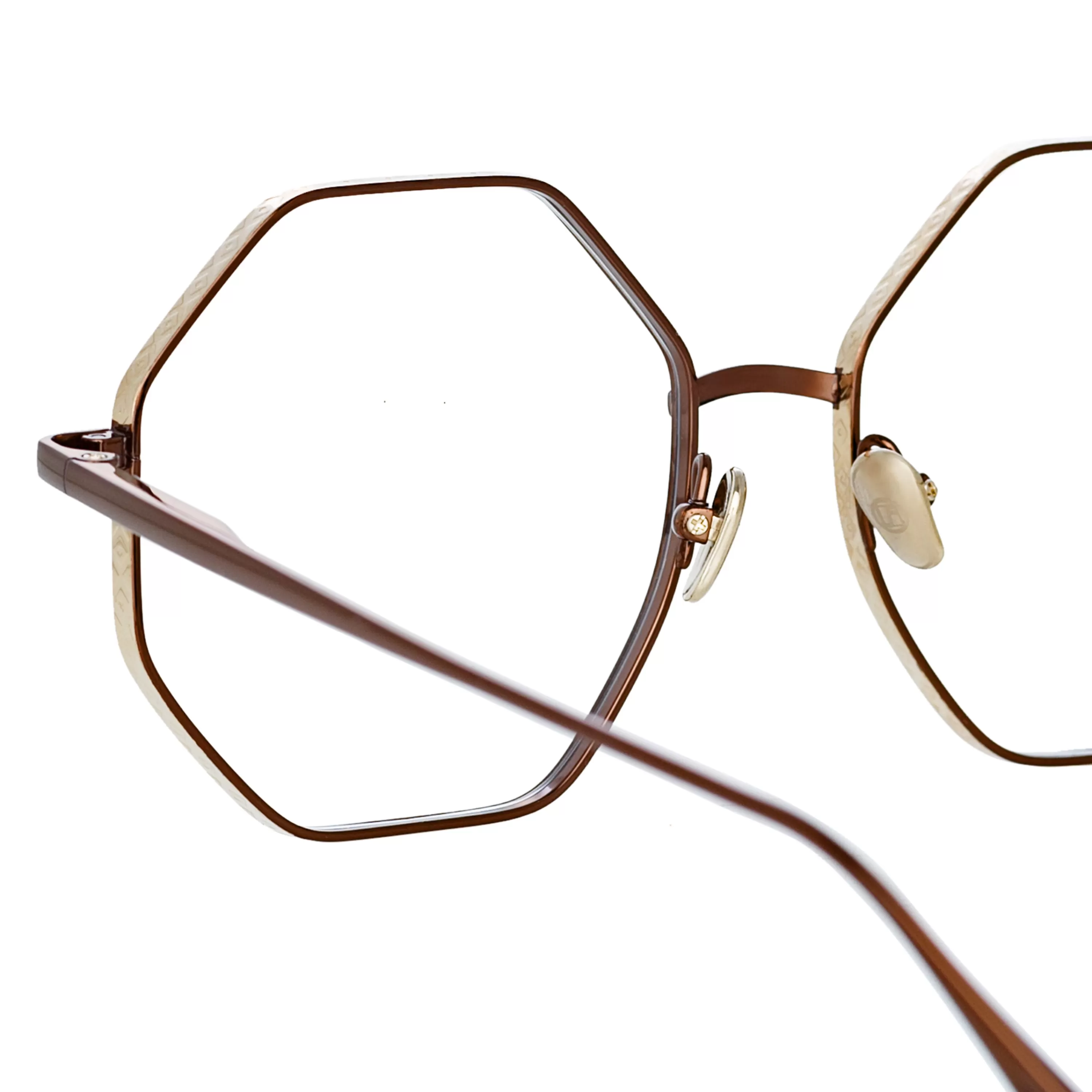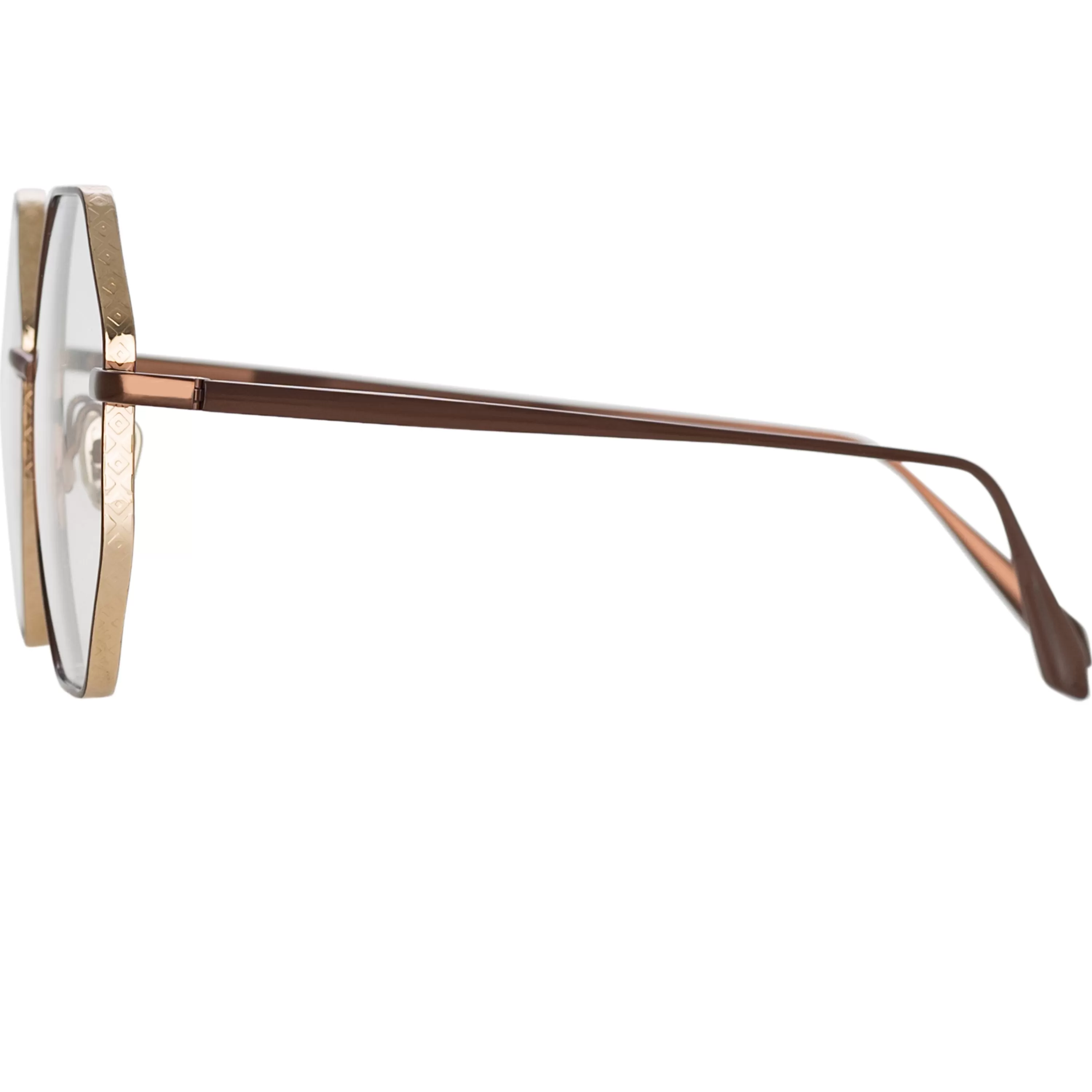 LINDA FARROW brings signature design language to this hexagonal silhouette. The Japanese titanium frame is coated in a metallic brown with a contrasting shiny 22 carat light gold edge.