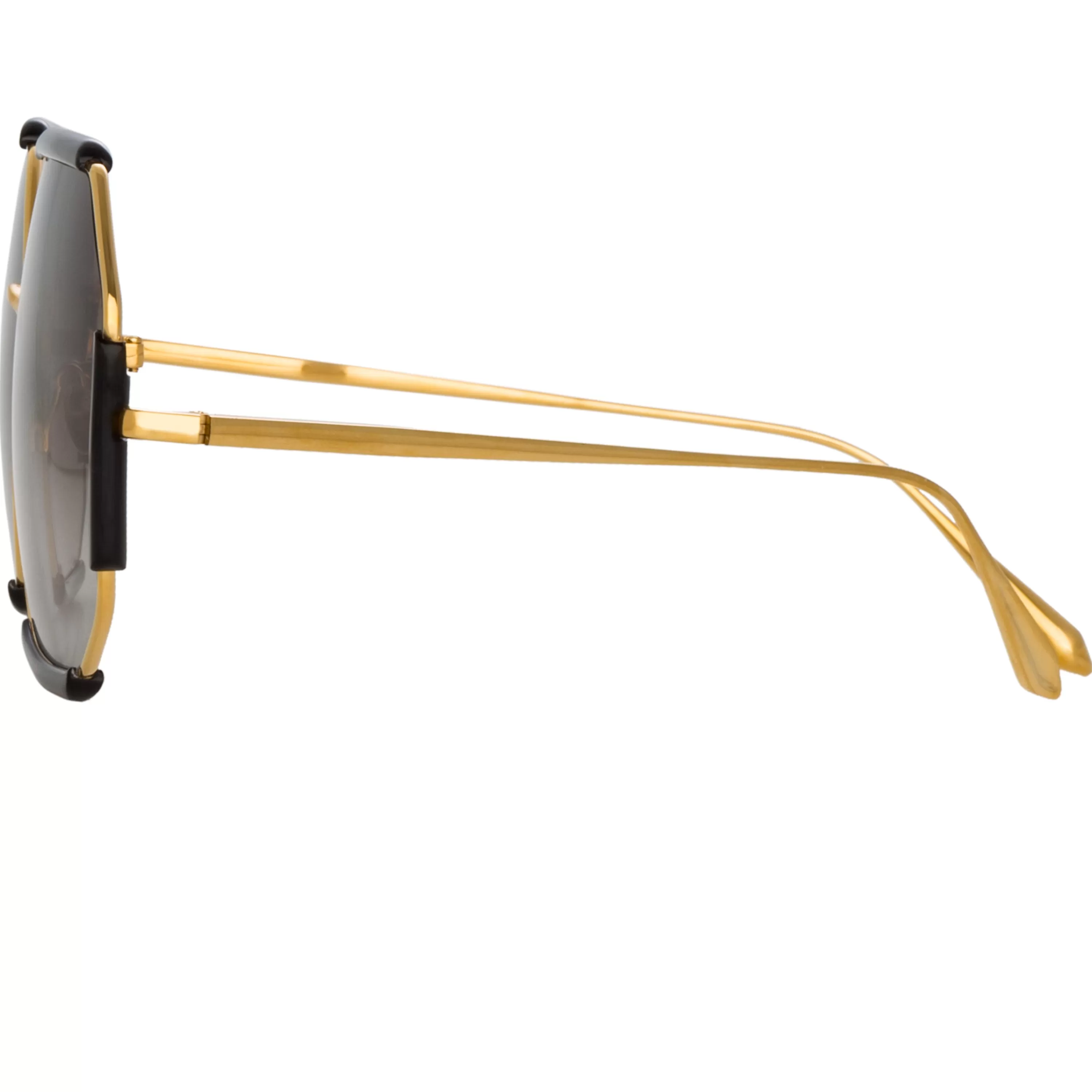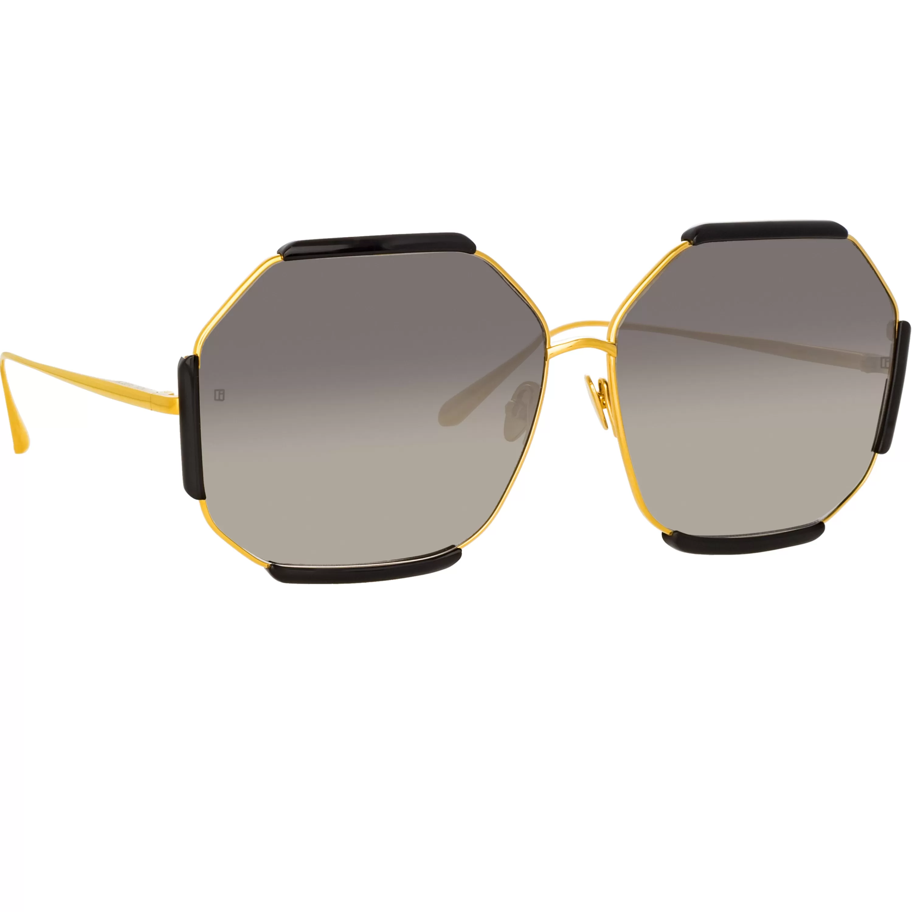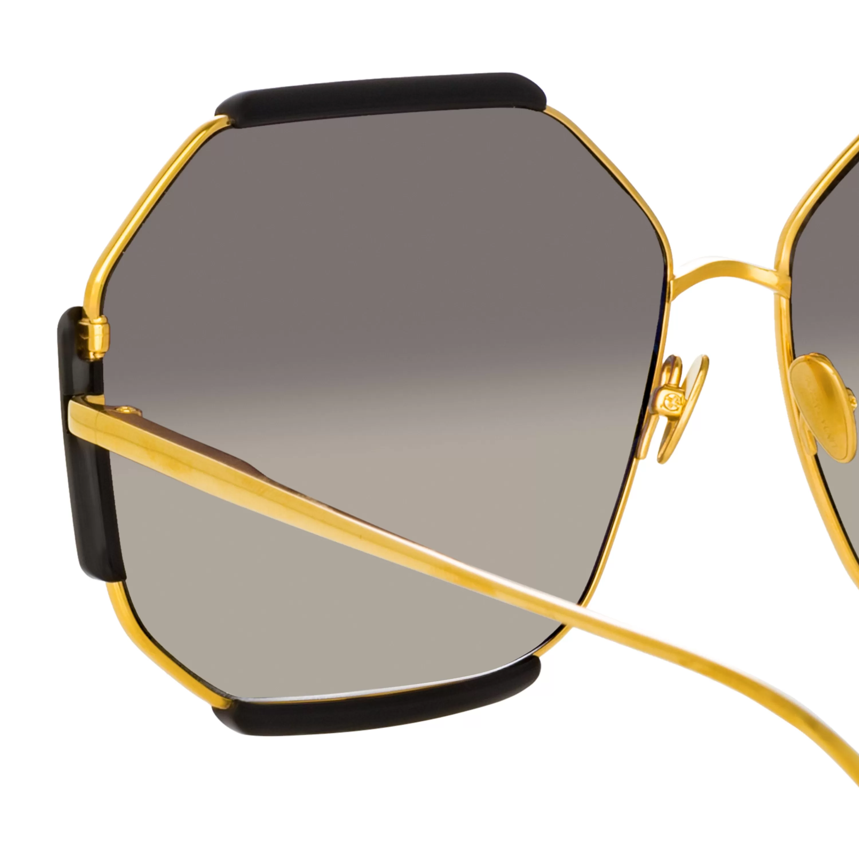Reminiscent of 1970s playful allure these hexagon sunglasses channel a quintessential LINDA FARROW design language. A delicate 22 carat yellow gold plated titanium rim is accented with glossy black acetate details.