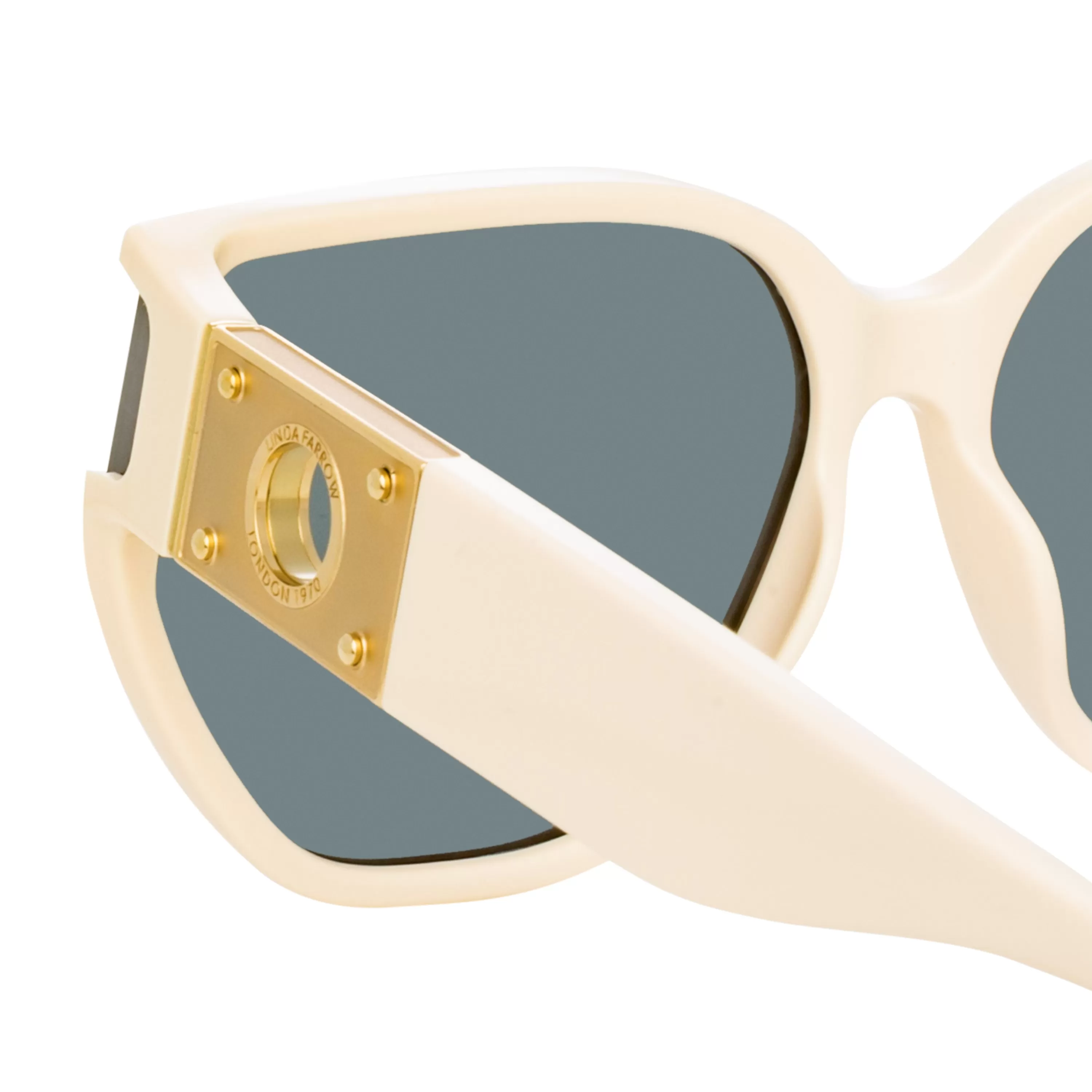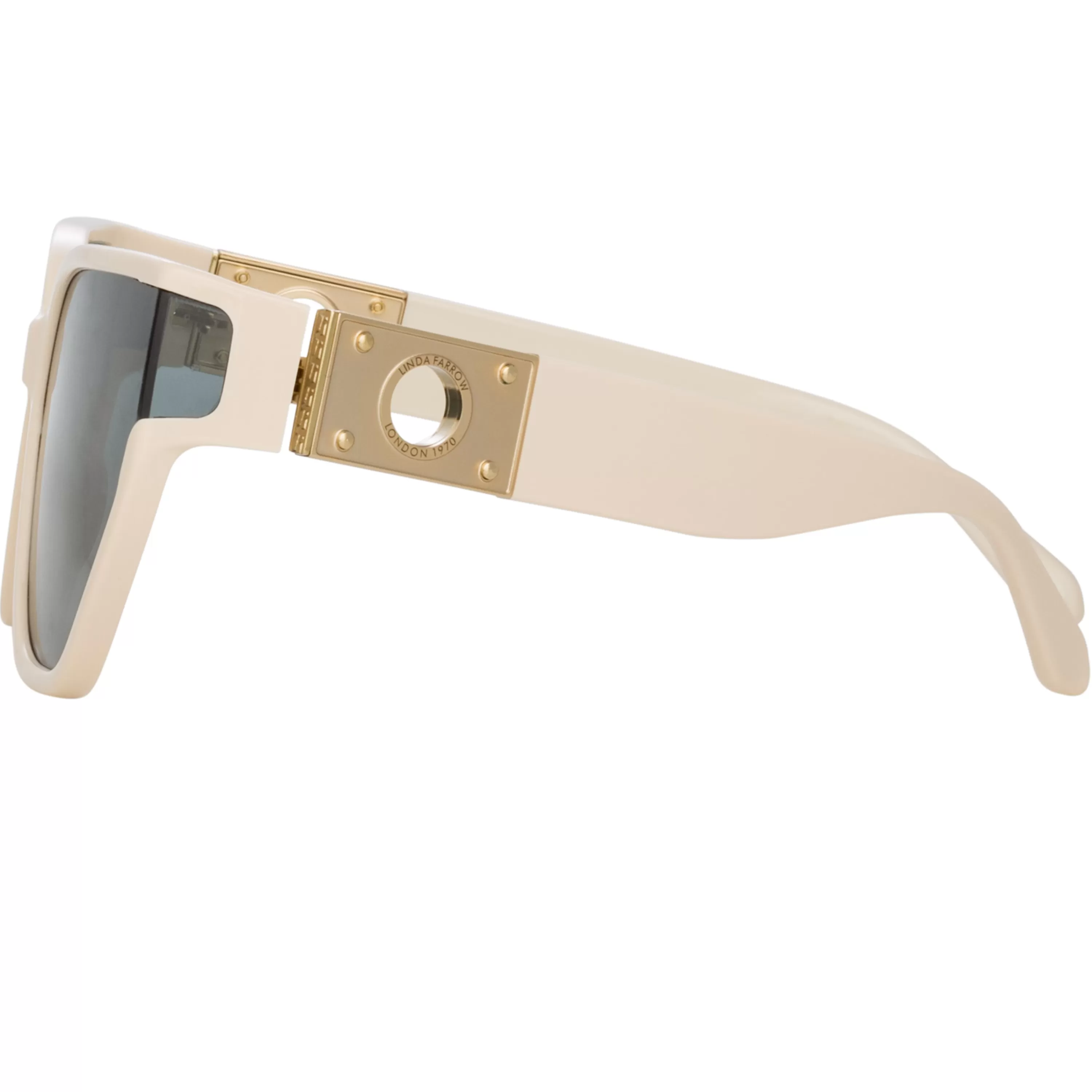 The detailing and form of the Sabine sunglasses require a closer look. The square cat eye silhouette uses sharp angles to take its shape. Sculpted from cream acetate the frame holds a right angled lens which extends round to form the temple connection. Grey nylon lenses offer anti-glare and 100% UV protection.