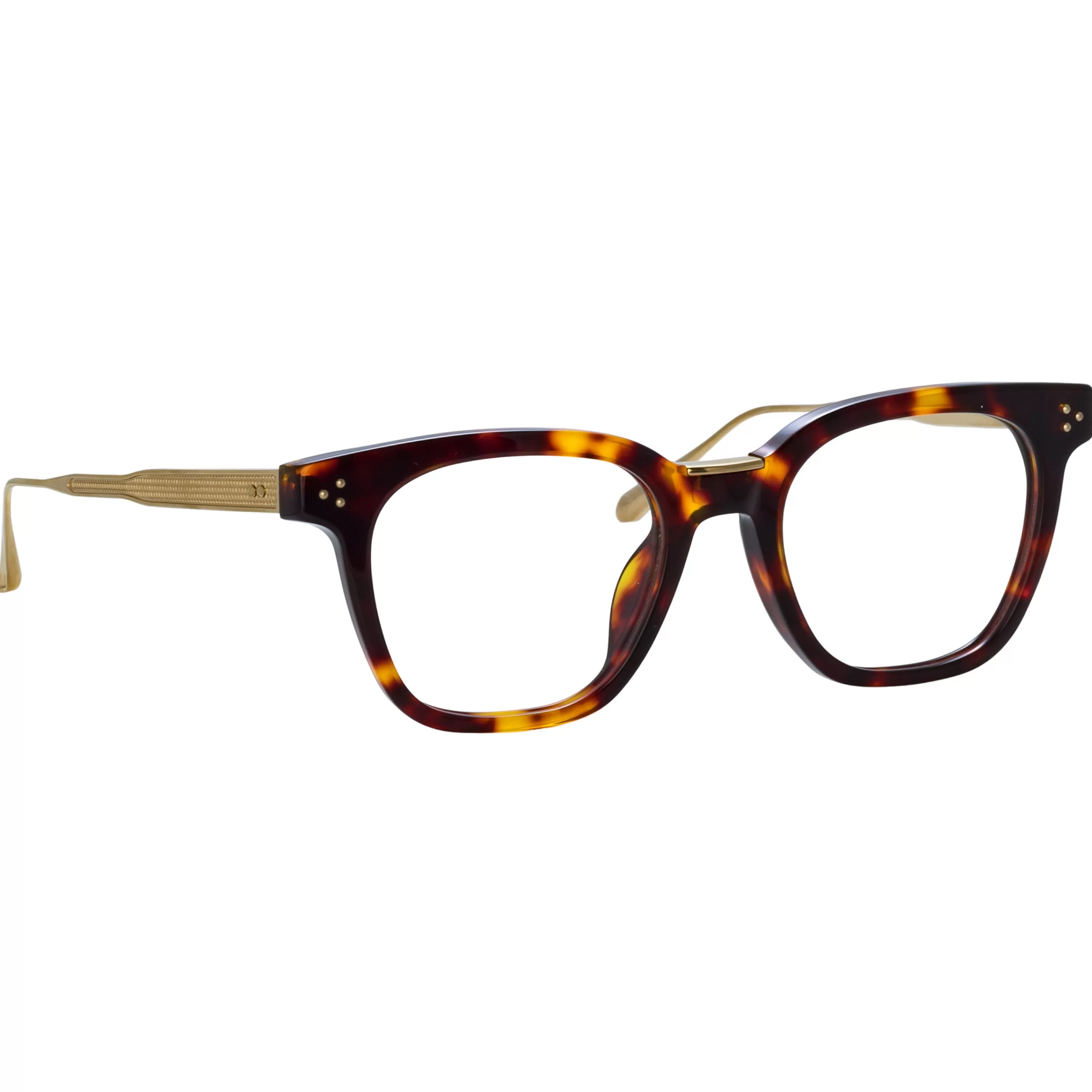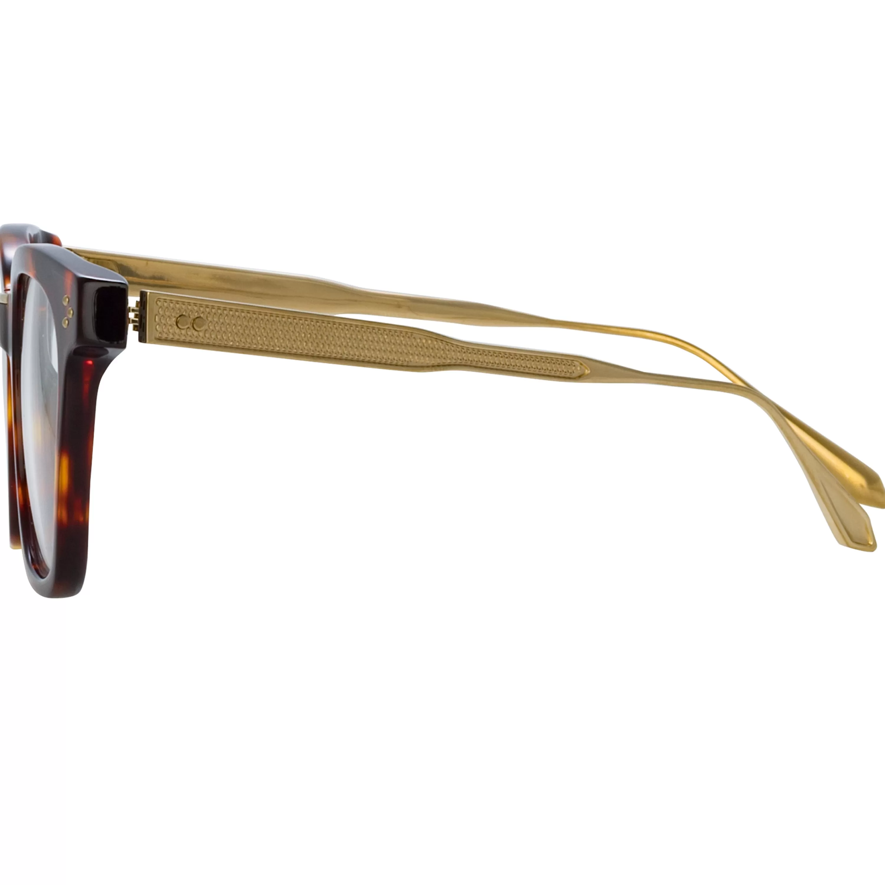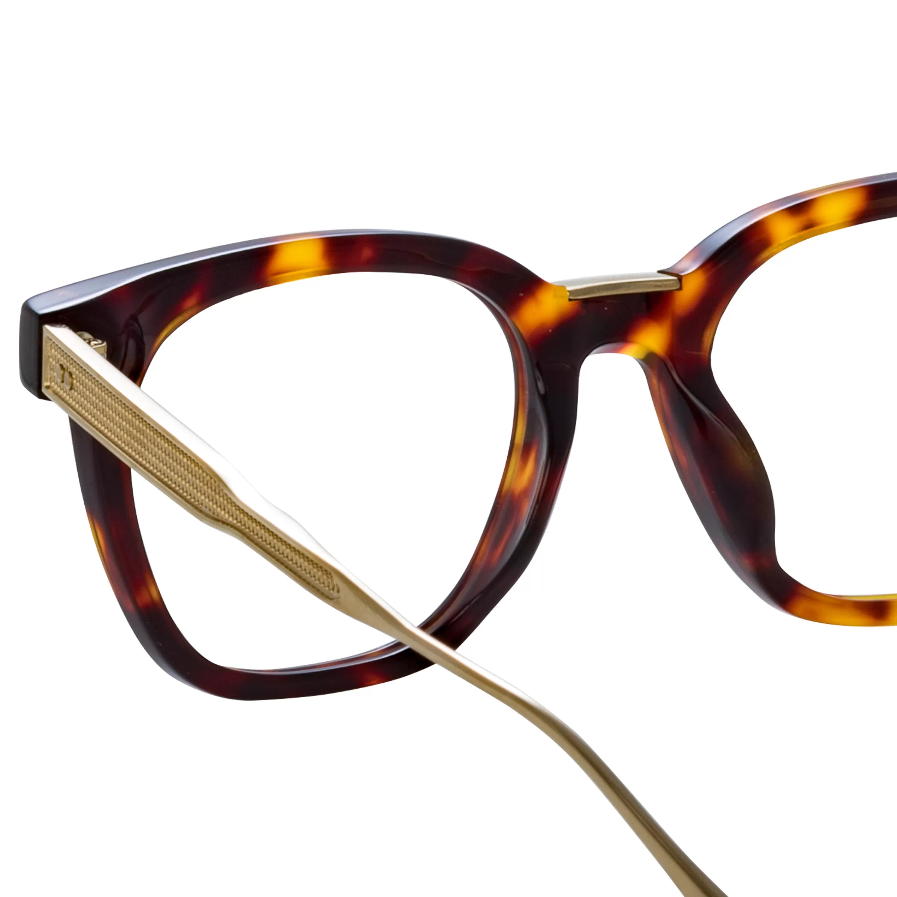 These expertly polished optical frames are crafted from tortoiseshell Italian acetate with a titanium temple.