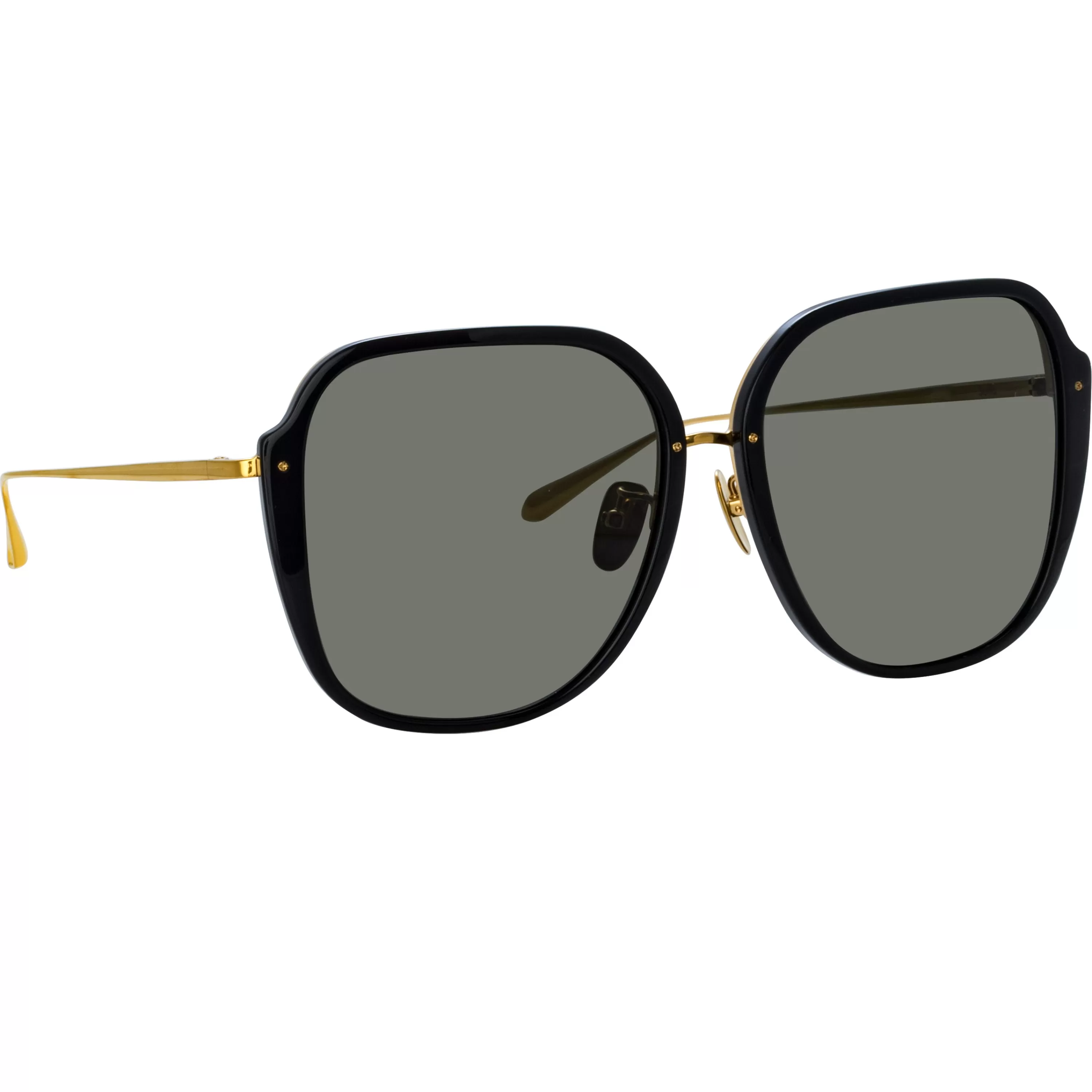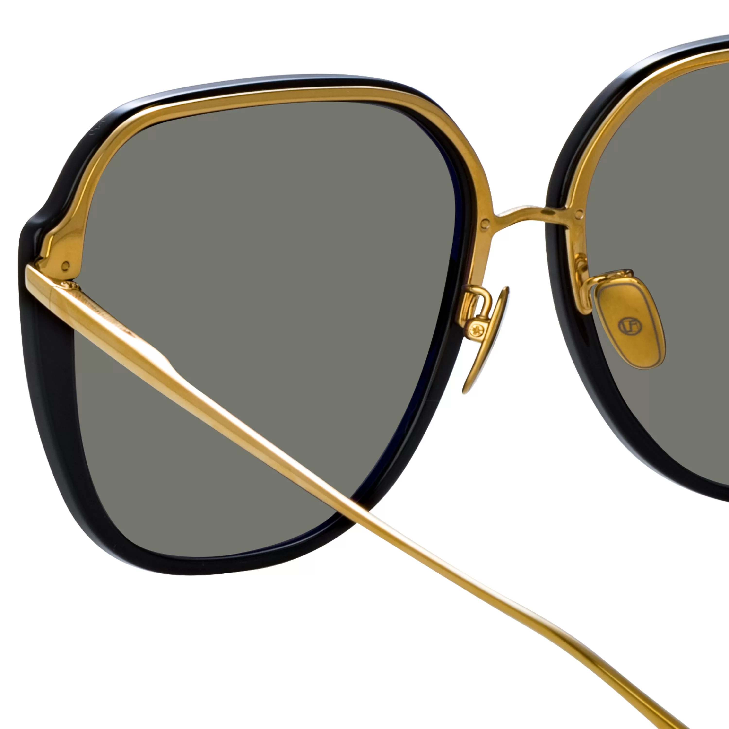 Experience luxury with the Sofia Oversize Sunglasses, expertly crafted from gold plated titanium and featuring grey solid lenses. These sunglasses are contoured with a chunky line of black acetate for a defined look, while the mid-frame titanium temples offer sleek and simple elegance.