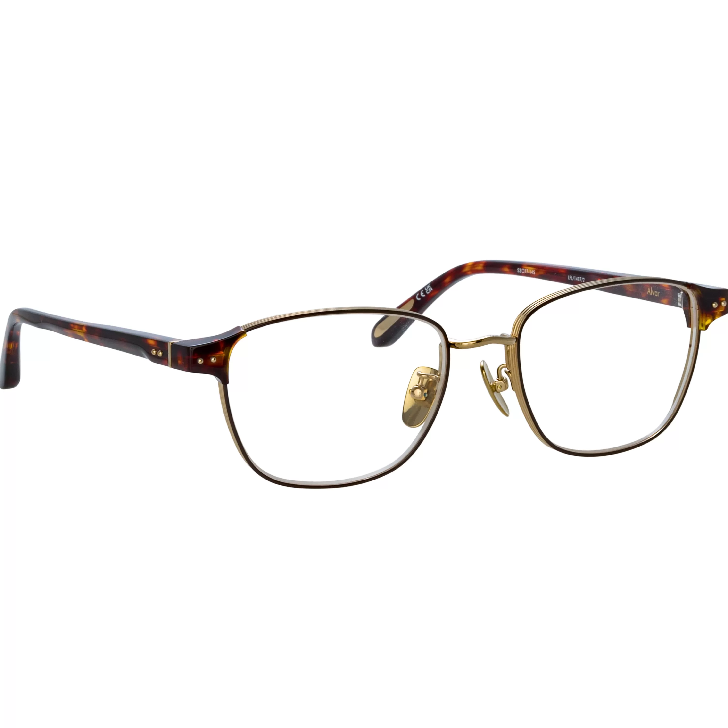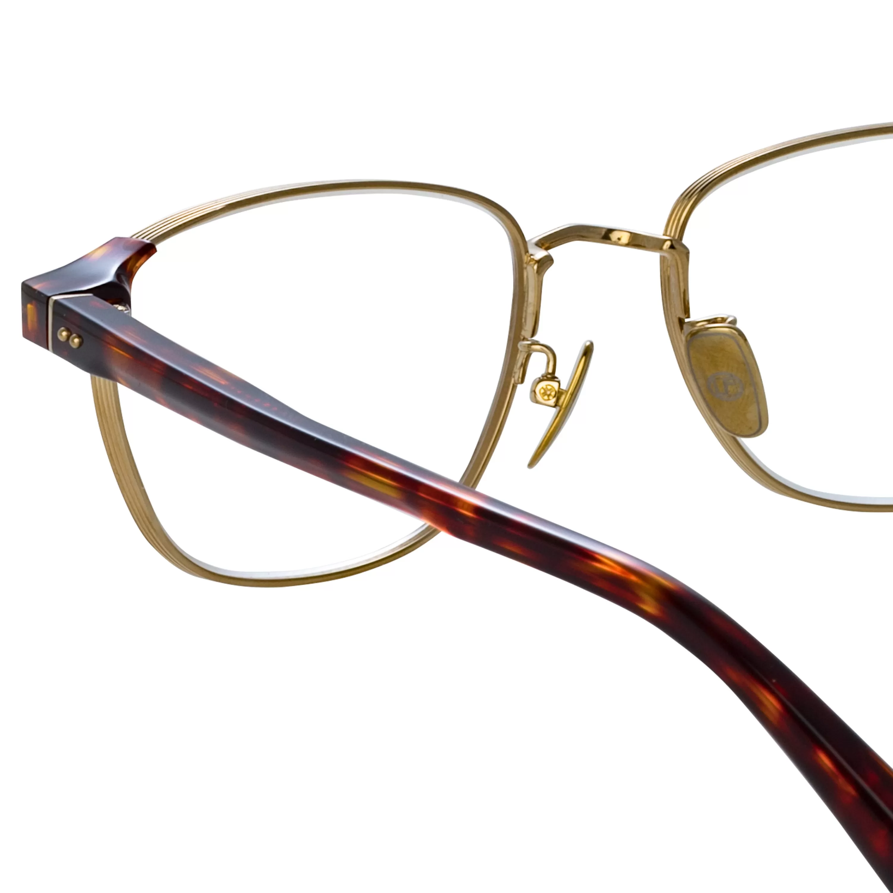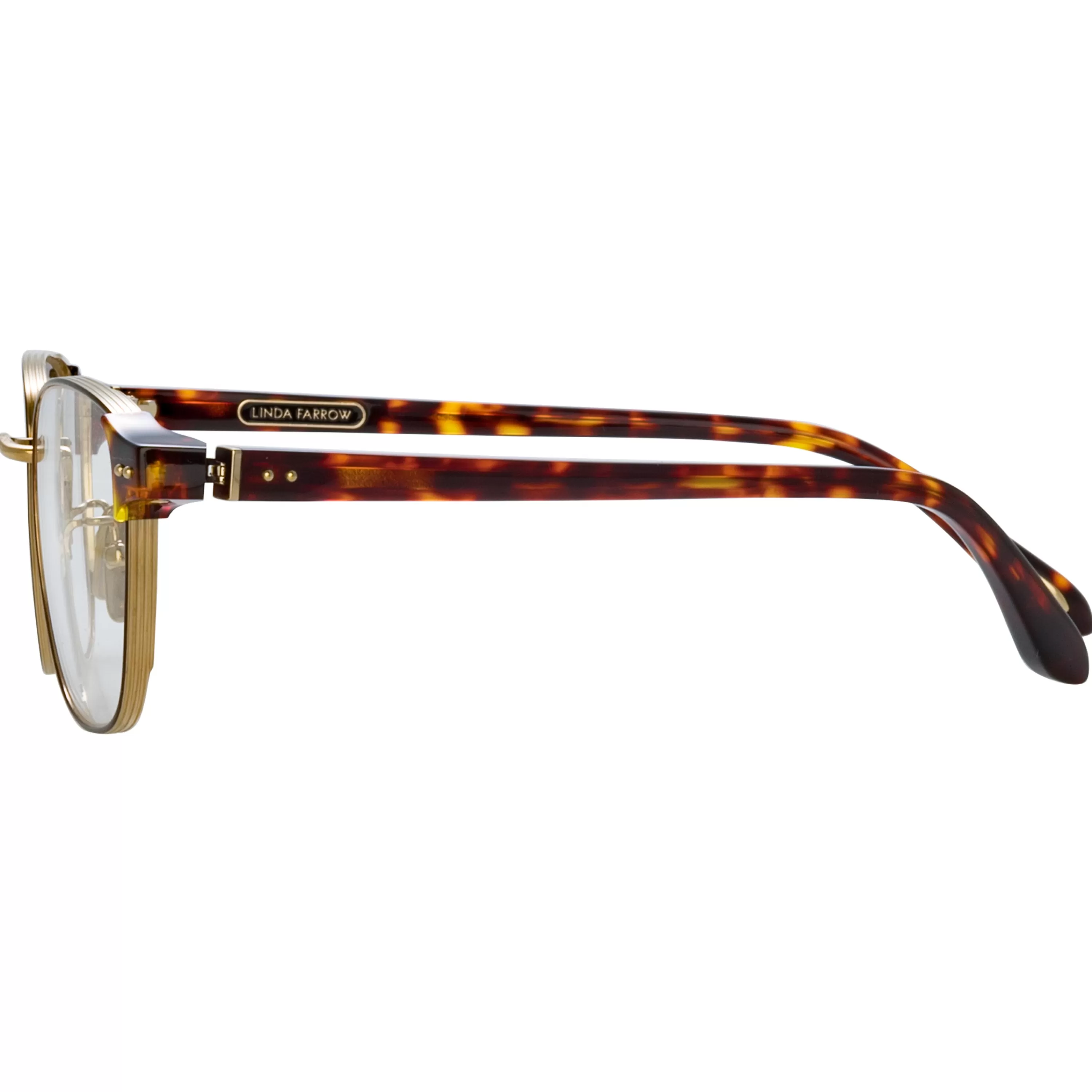 These angular D-Frame eyeglasses from the LINDA FARROW collection represent the perfect balance of engineering and craftsmanship. Pressed from 22 carat light gold plated Japanese titanium, the frame is fitted with elegant tortoiseshell acetate temples.