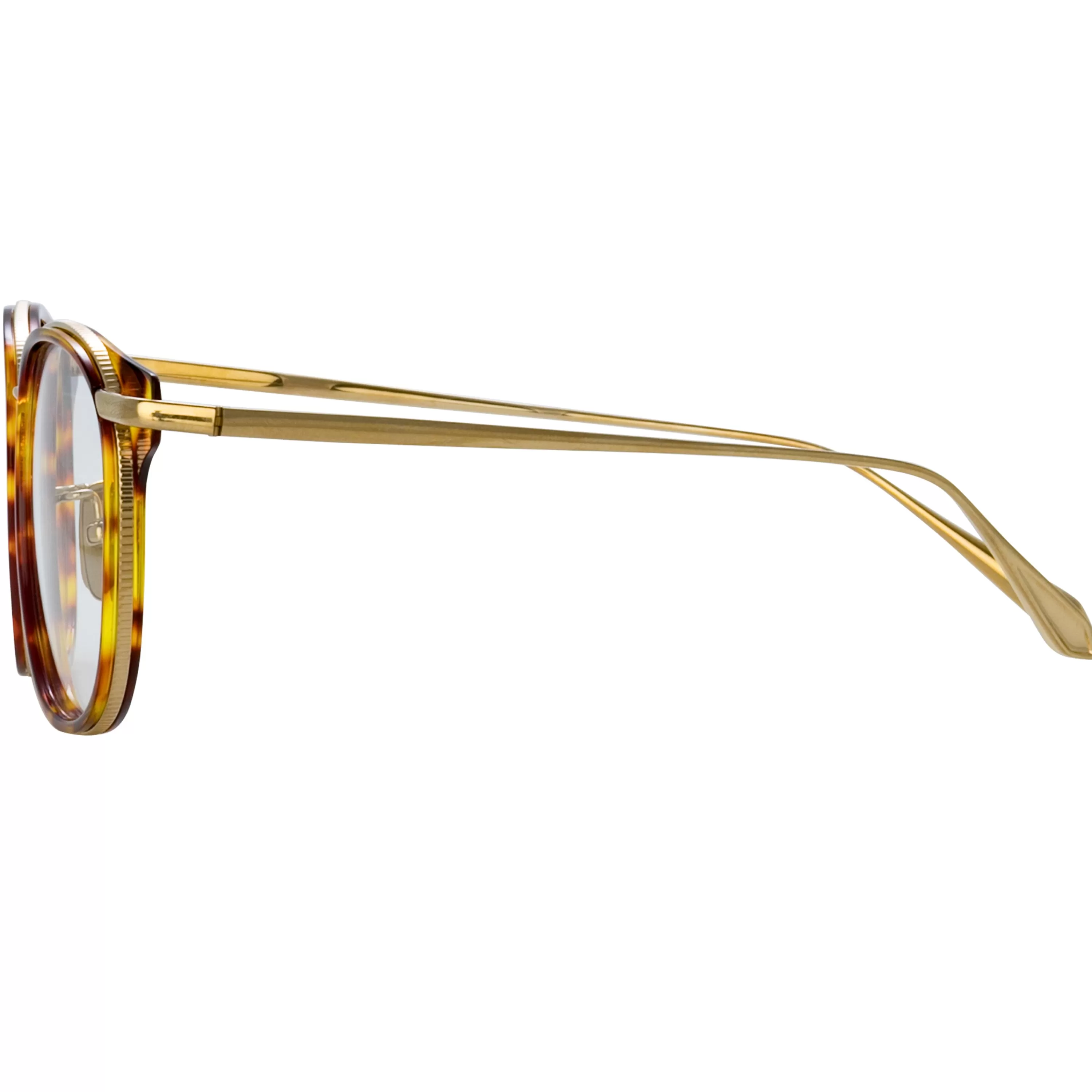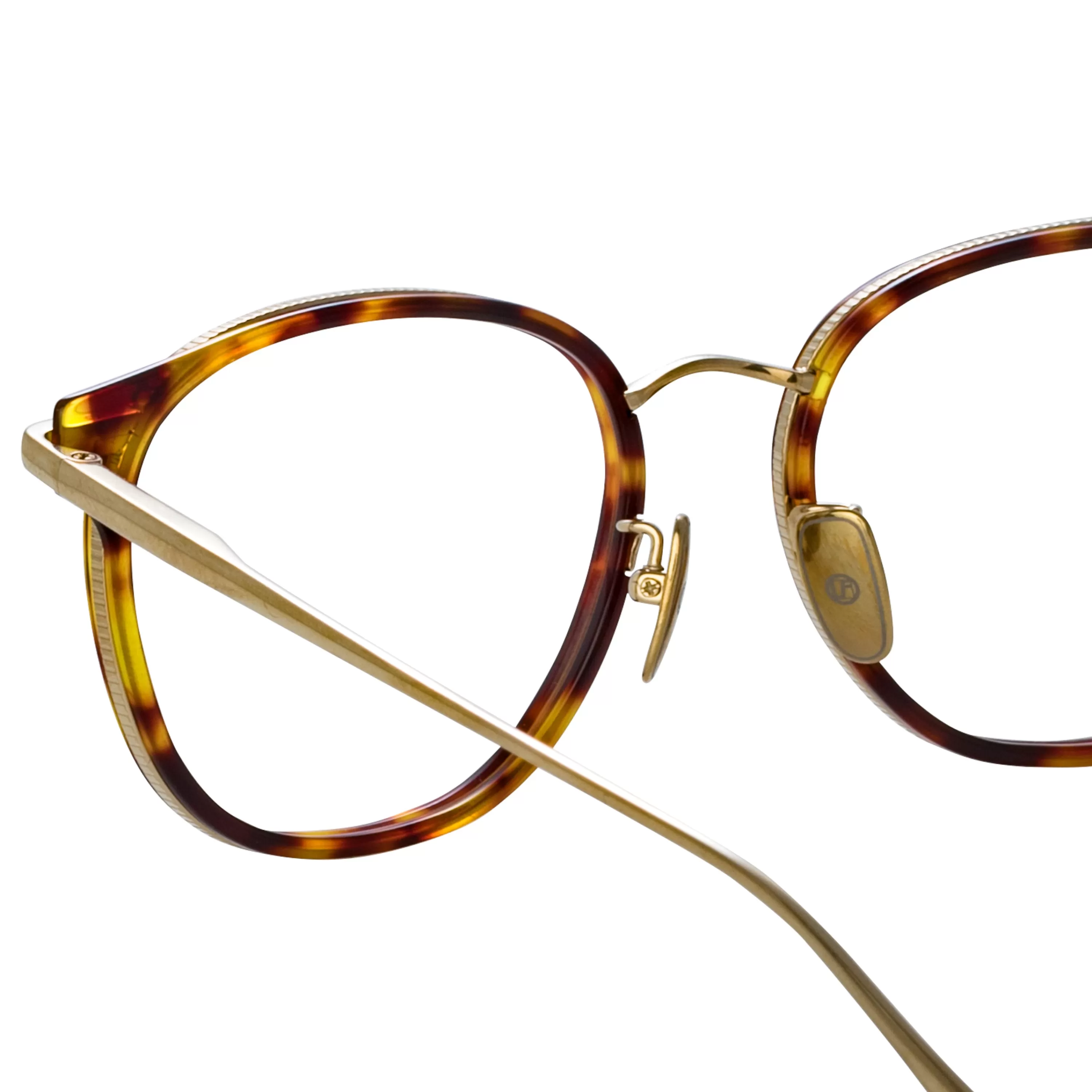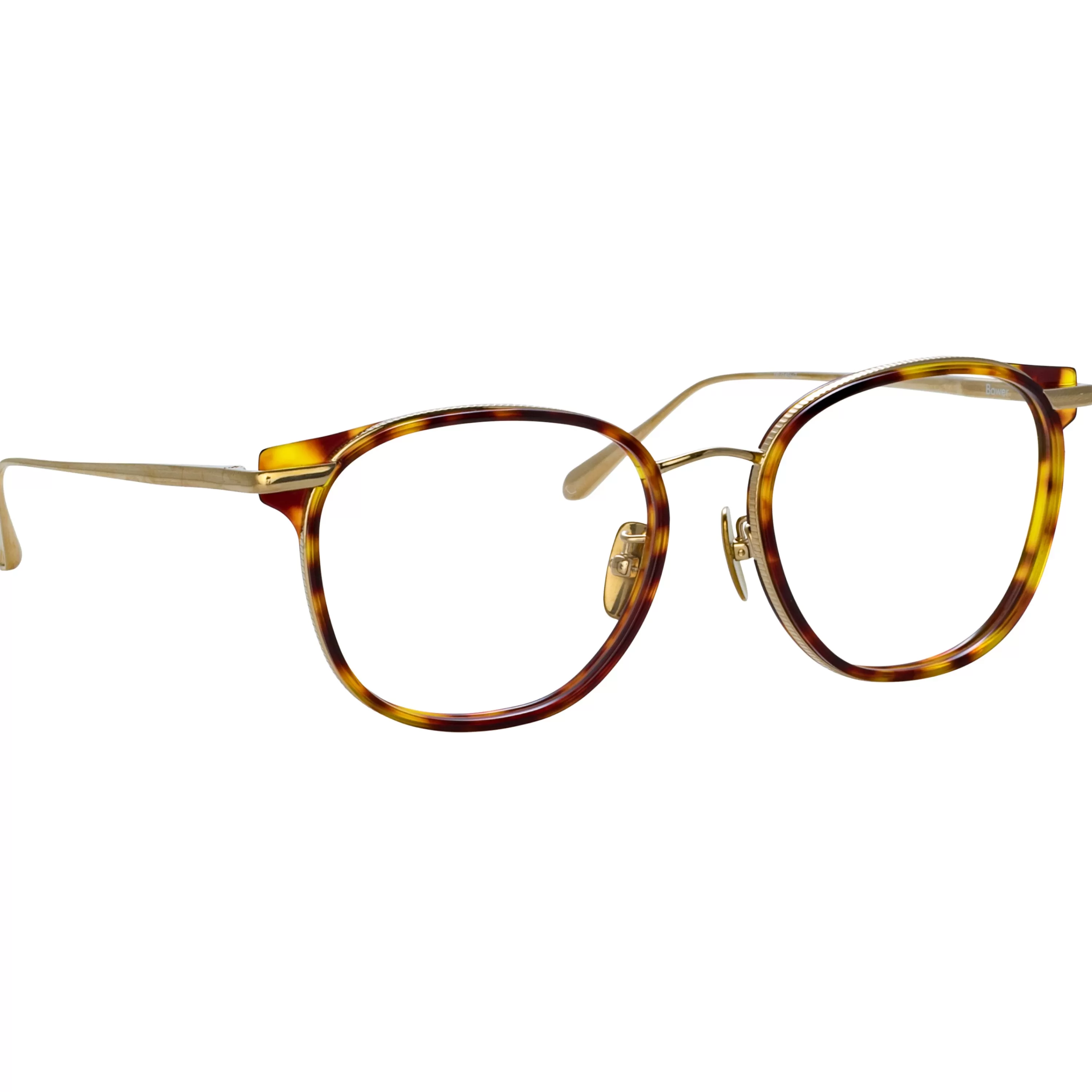 These D-Frame eyeglasses from the LINDA FARROW collection perfectly balance engineering and craftsmanship. These unisex Linda Farrow optical glasses pair Tortoiseshell Italian acetate with 18-22 carat light gold-plated titanium, which appears elegantly ‘trapped’ inside the frame.