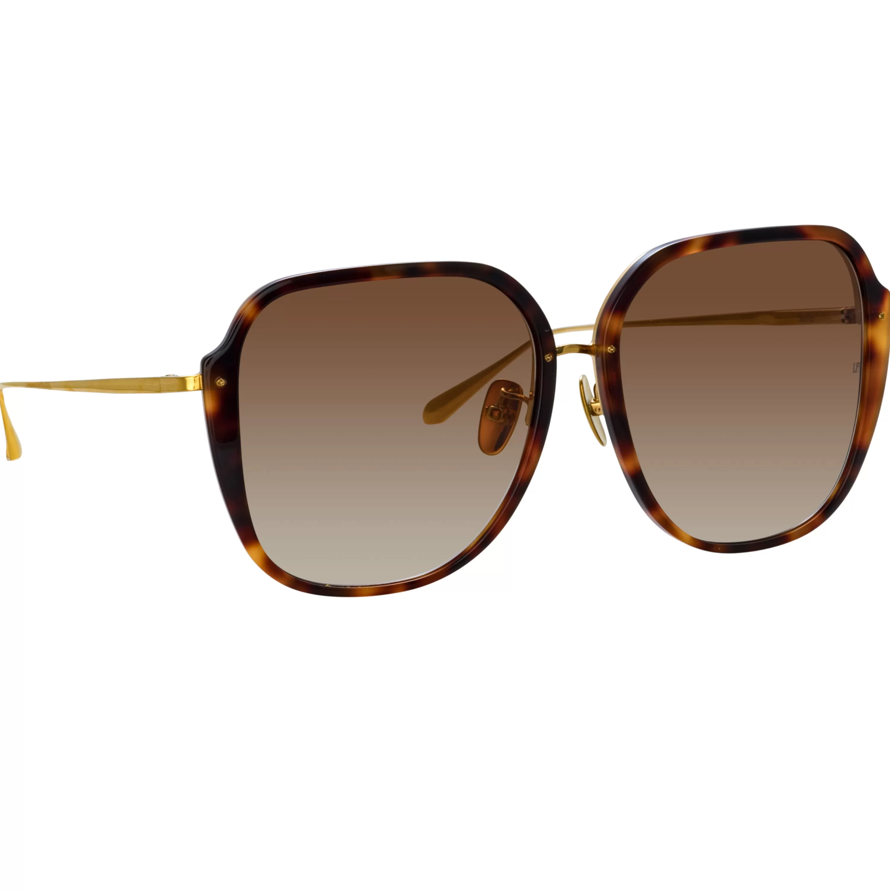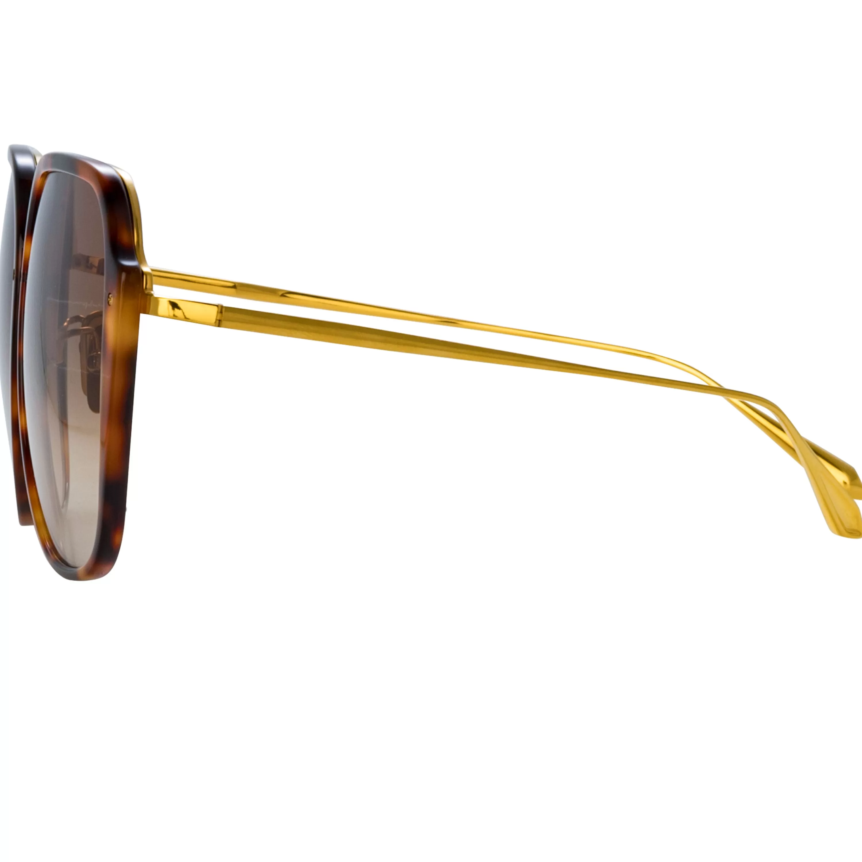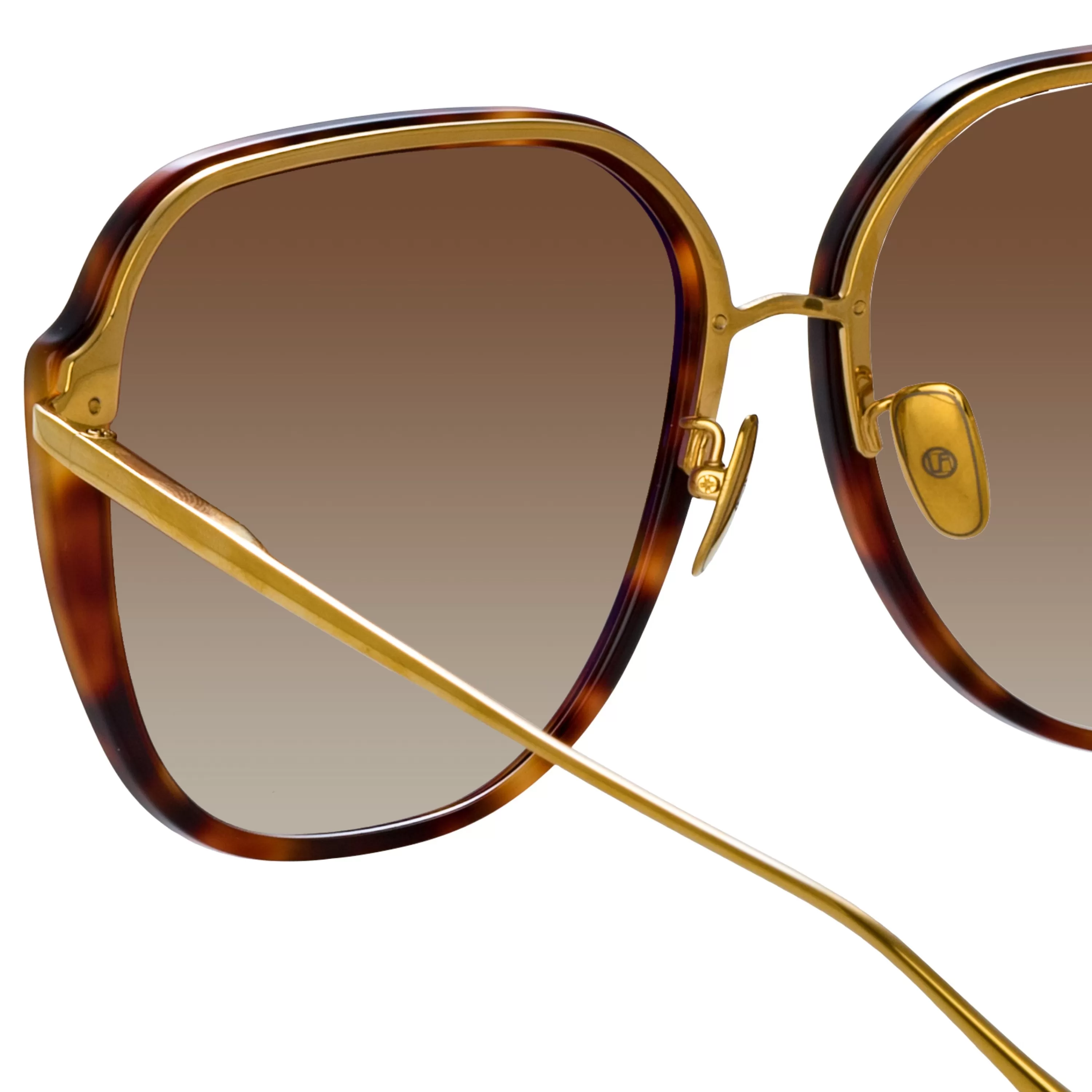 Experience luxury with the Sofia Oversize Sunglasses, expertly crafted from gold plated titanium and tortoiseshell acetate. These sunglasses feature brown gradient lenses for a sophisticated look, complemented by a chunky line of tortoiseshell acetate for definition.