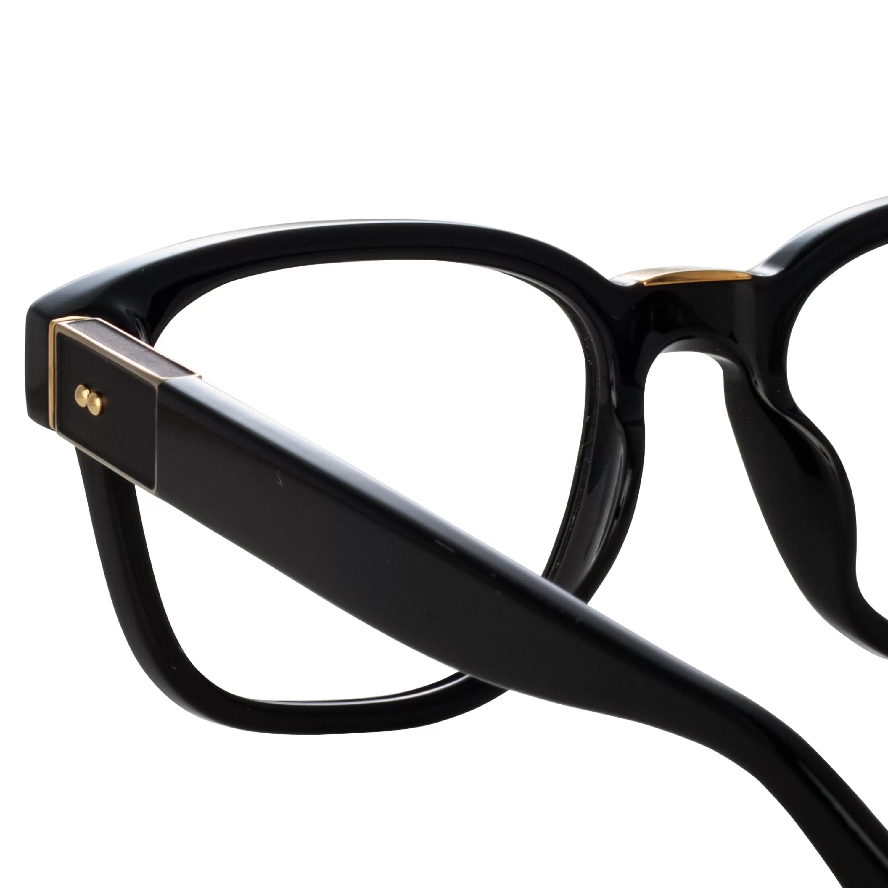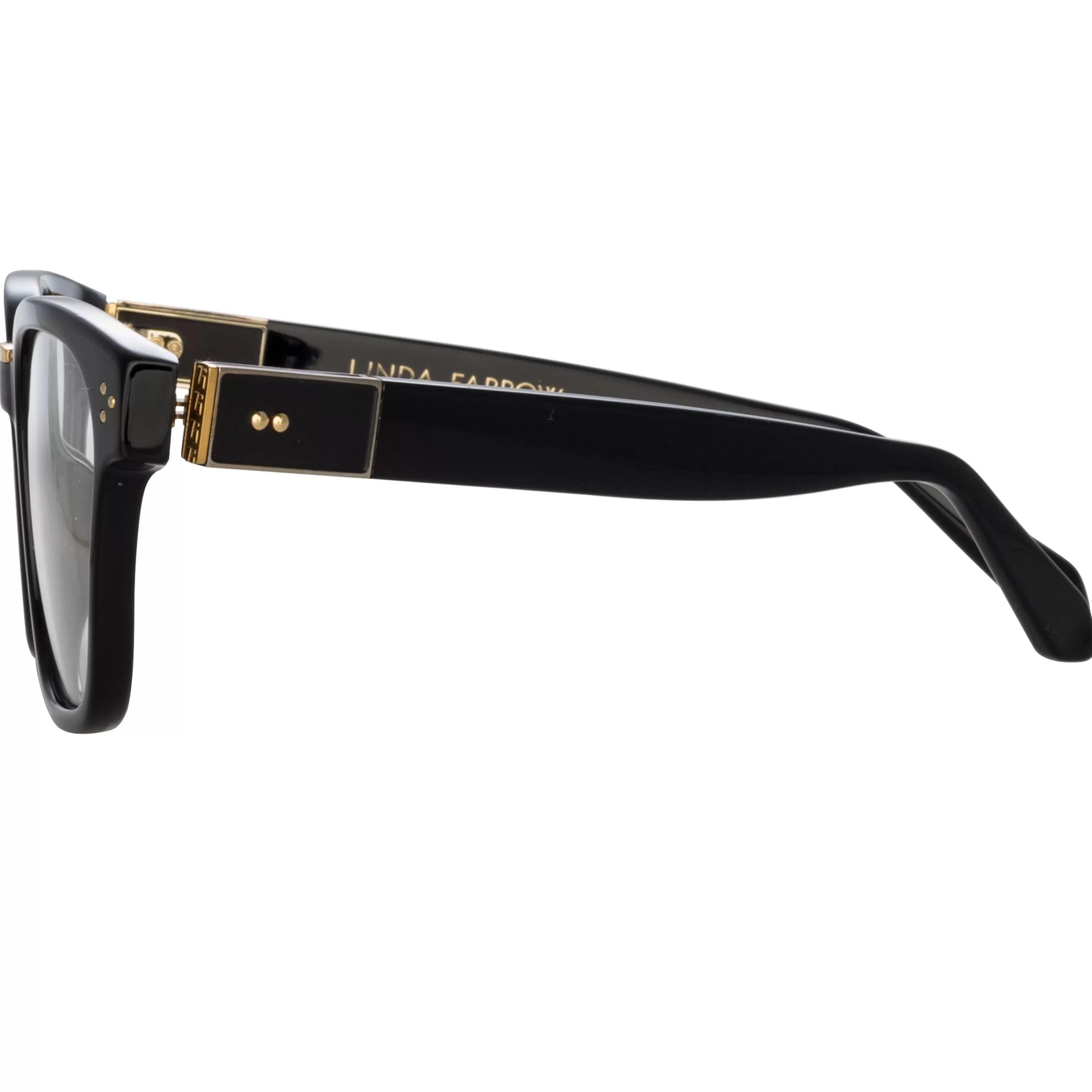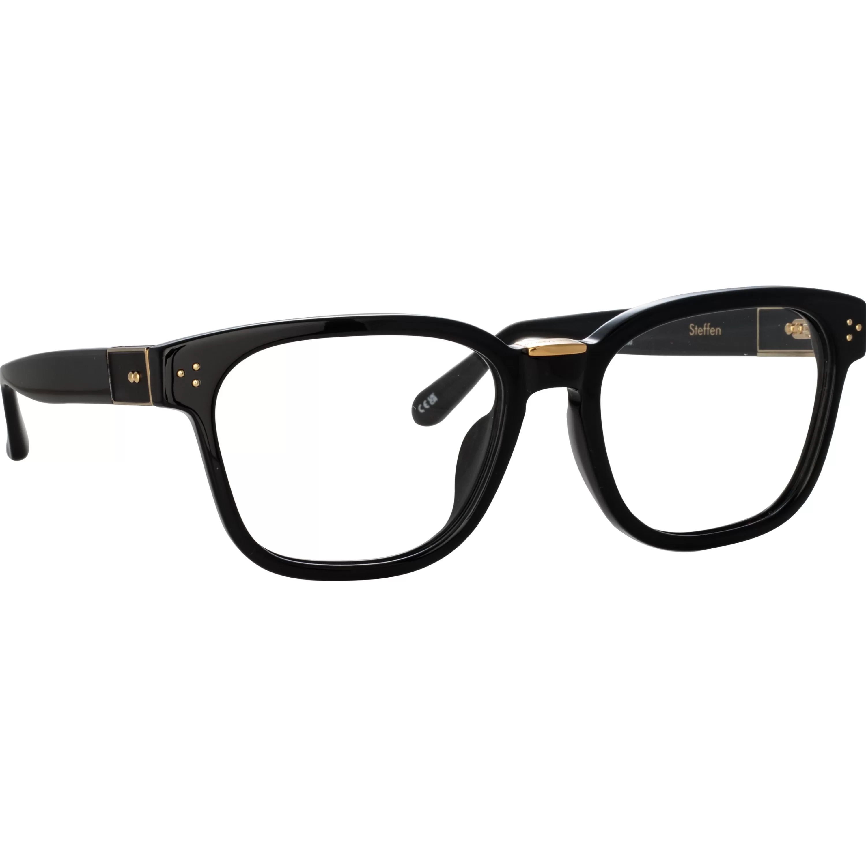 Introducing the Steffen optical frame, LINDA FARROW’s take on the classic D-frame. Sculpted from black acetate, the beveled acetate temples transition into sculpted tips finished with inset gold plated highlights.